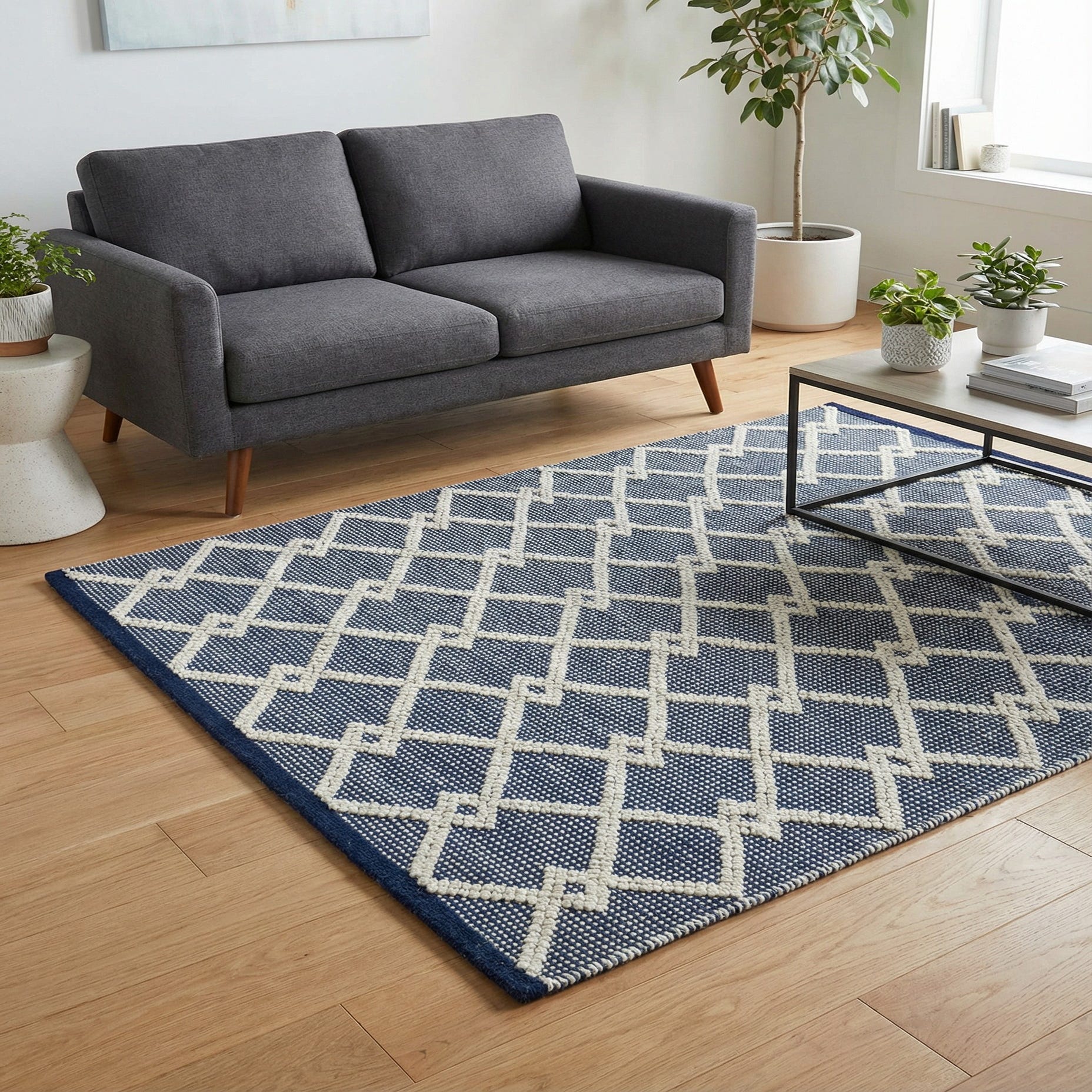 Primary color is Blueberry. Colors in this rug include: Blueberry, Ivory.
