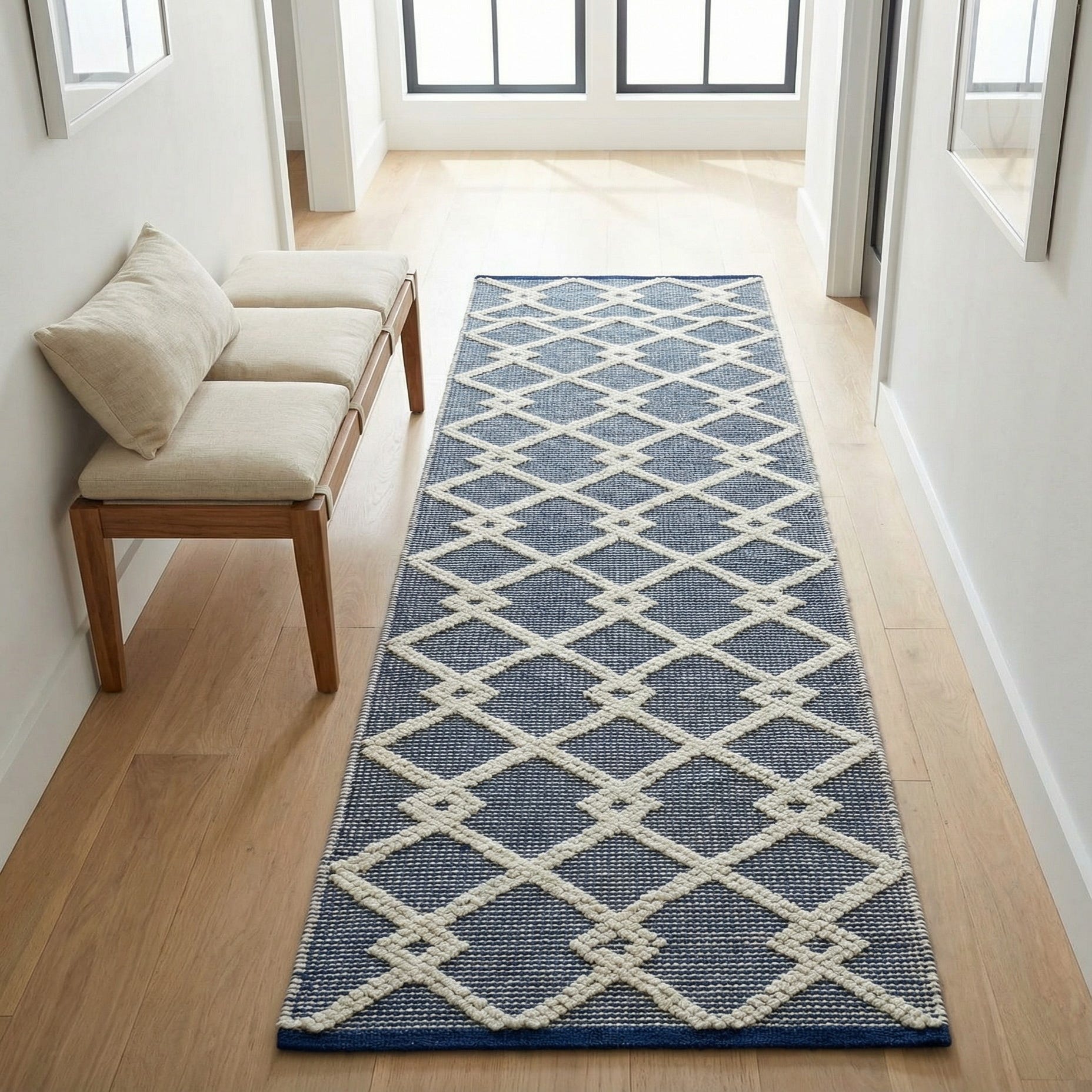 Primary color is Blueberry. Colors in this rug include: Blueberry, Ivory.