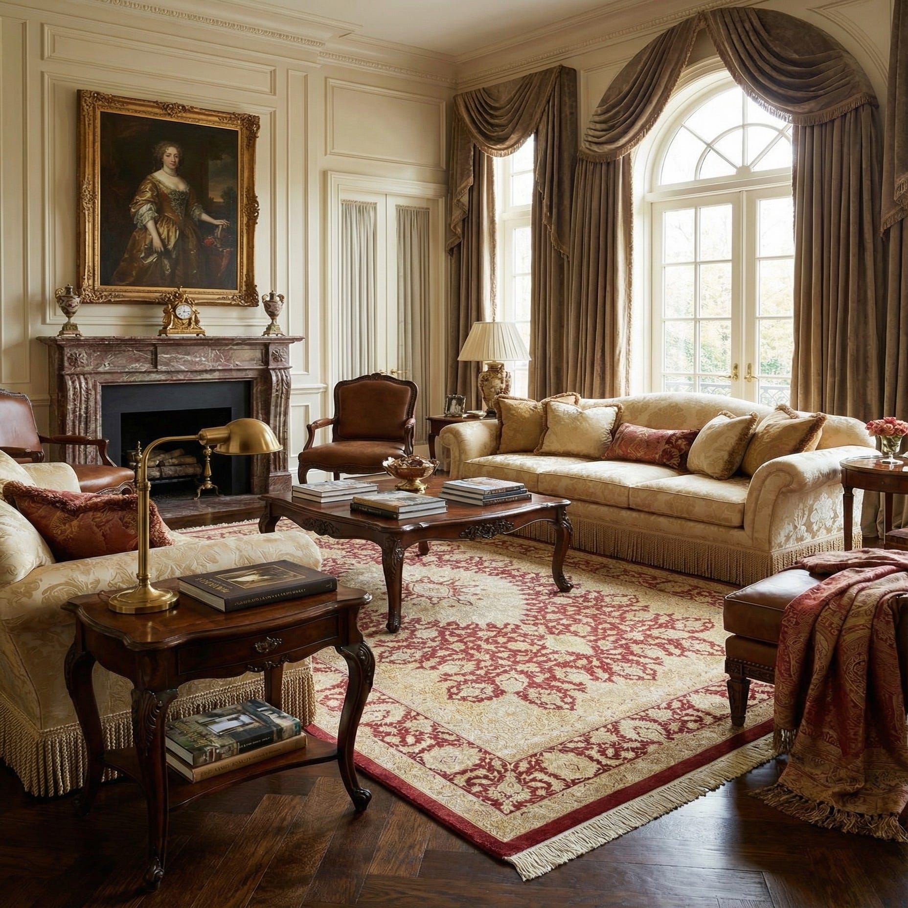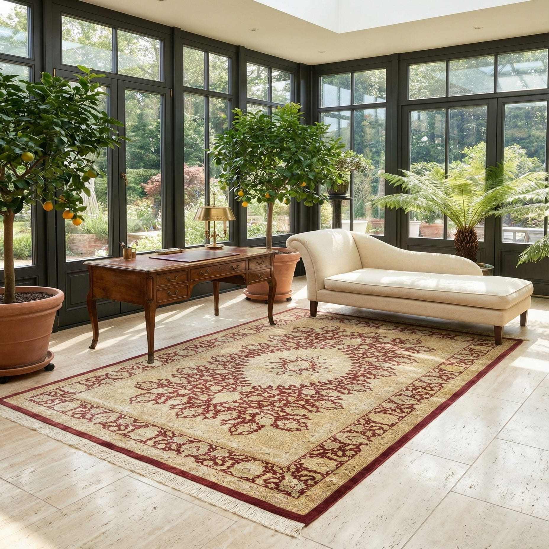 Primary color is Bordeaux. Colors in this rug include: Bordeaux, Burgundy, Cream, Beige, Yellow, Green.