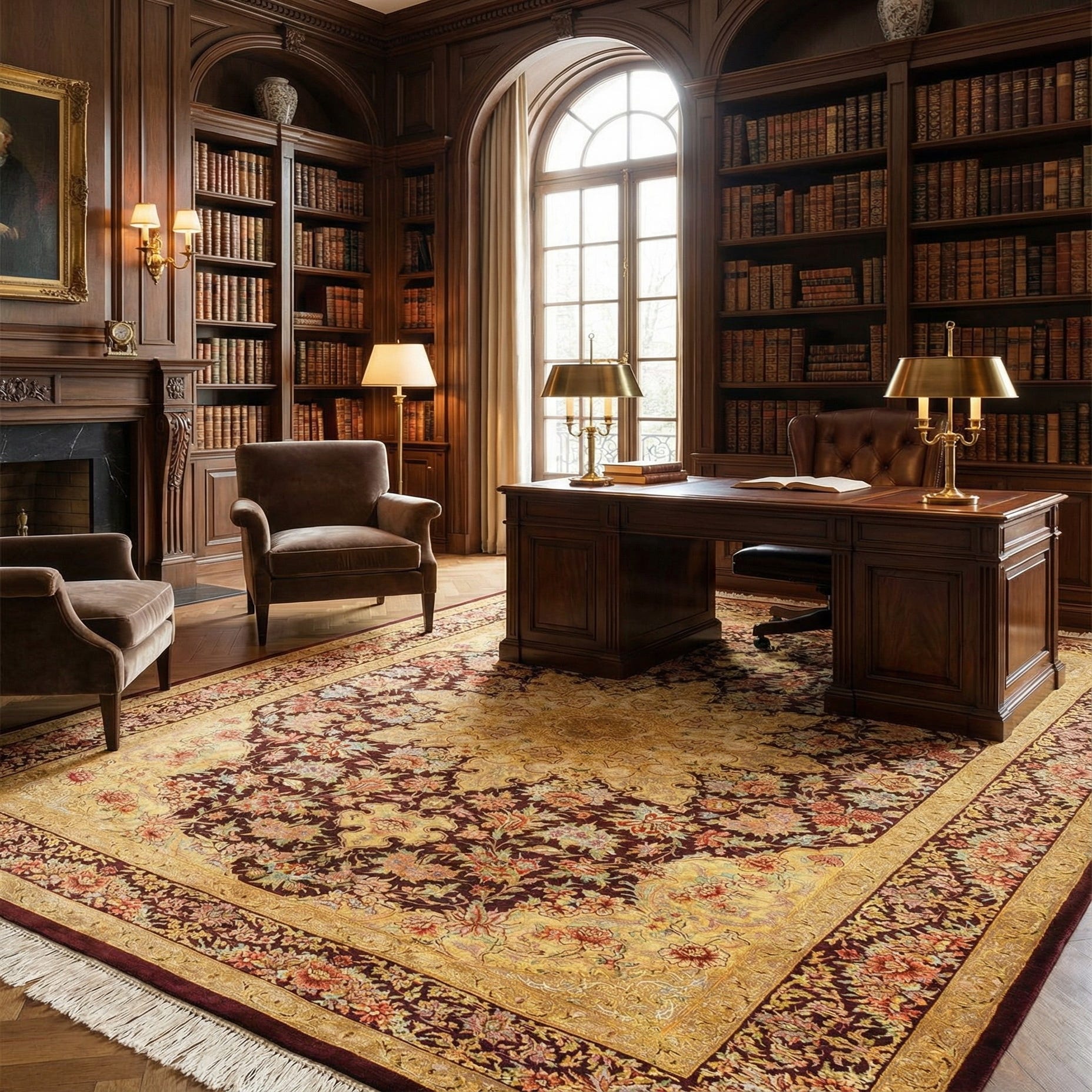 Primary color is Bordeaux. Colors in this rug include: Bordeaux, Burgundy, Beige, Gold, Brown, Green, Red.