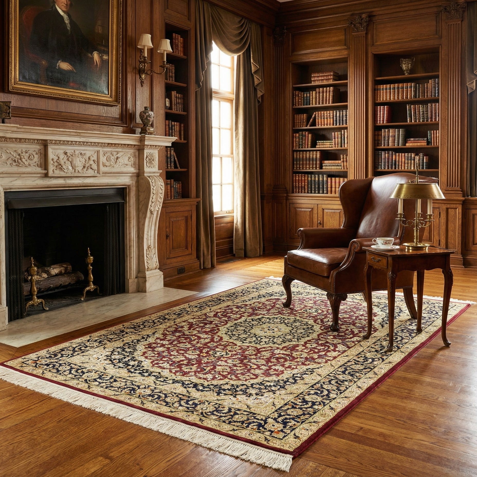 Primary color is Bordeaux. Colors in this rug include: Bordeaux, Bordeaux, Dark Blue, Beige, Cream, Pink, Orange.