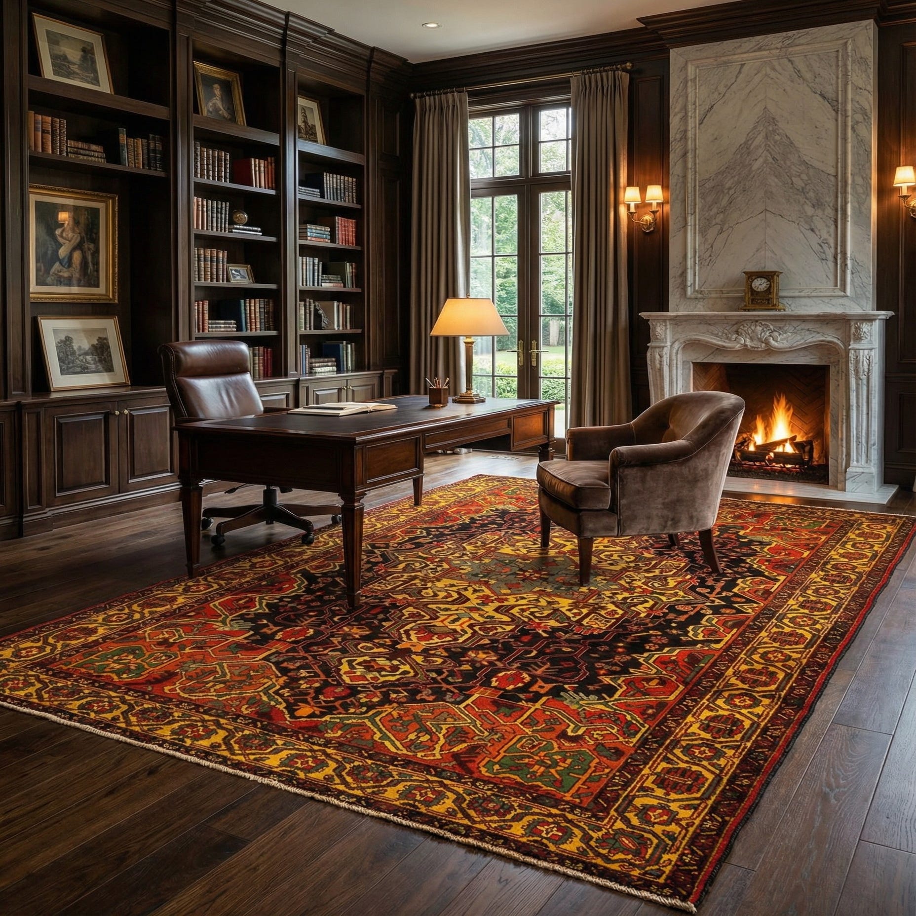 Primary color is Bordeaux. Colors in this rug include: Bordeaux, Burgundy, Yellow, Dark Brown, Green, Orange, Red, Grey.