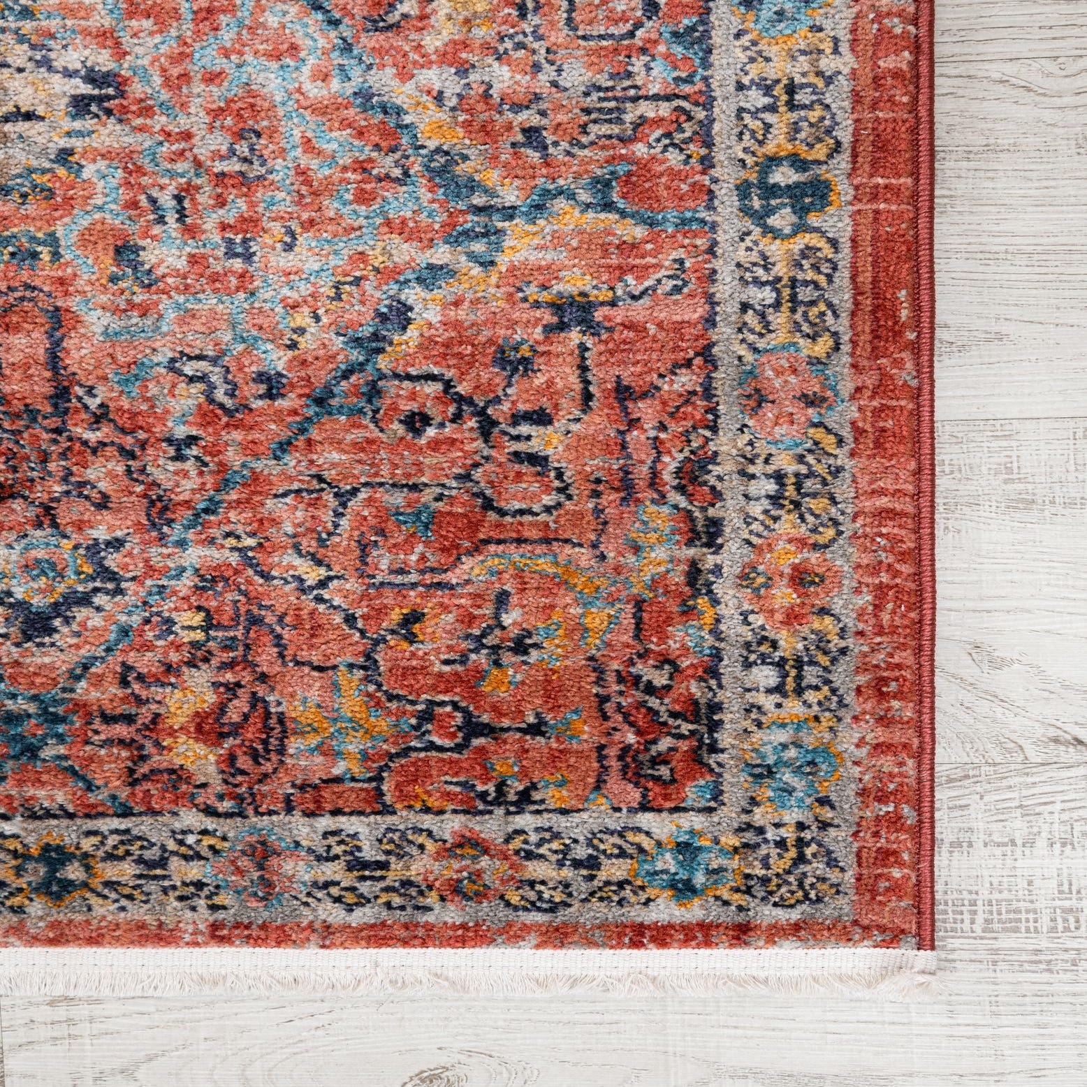 Primary color is Brick Red. Colors in this rug include: Brick Red, Blue, Ivory, Light Blue, Orange, Yellow.