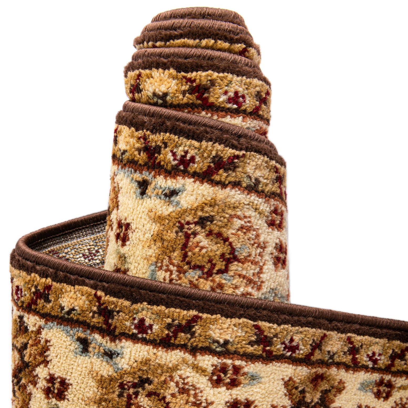 Primary color is Brown. Colors in this rug include: Brown, Cream, Red, Tan, Light Blue, Light Green, Peach.