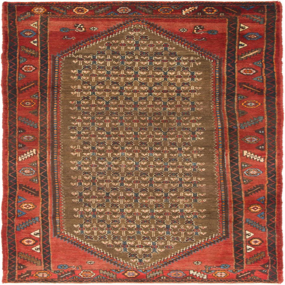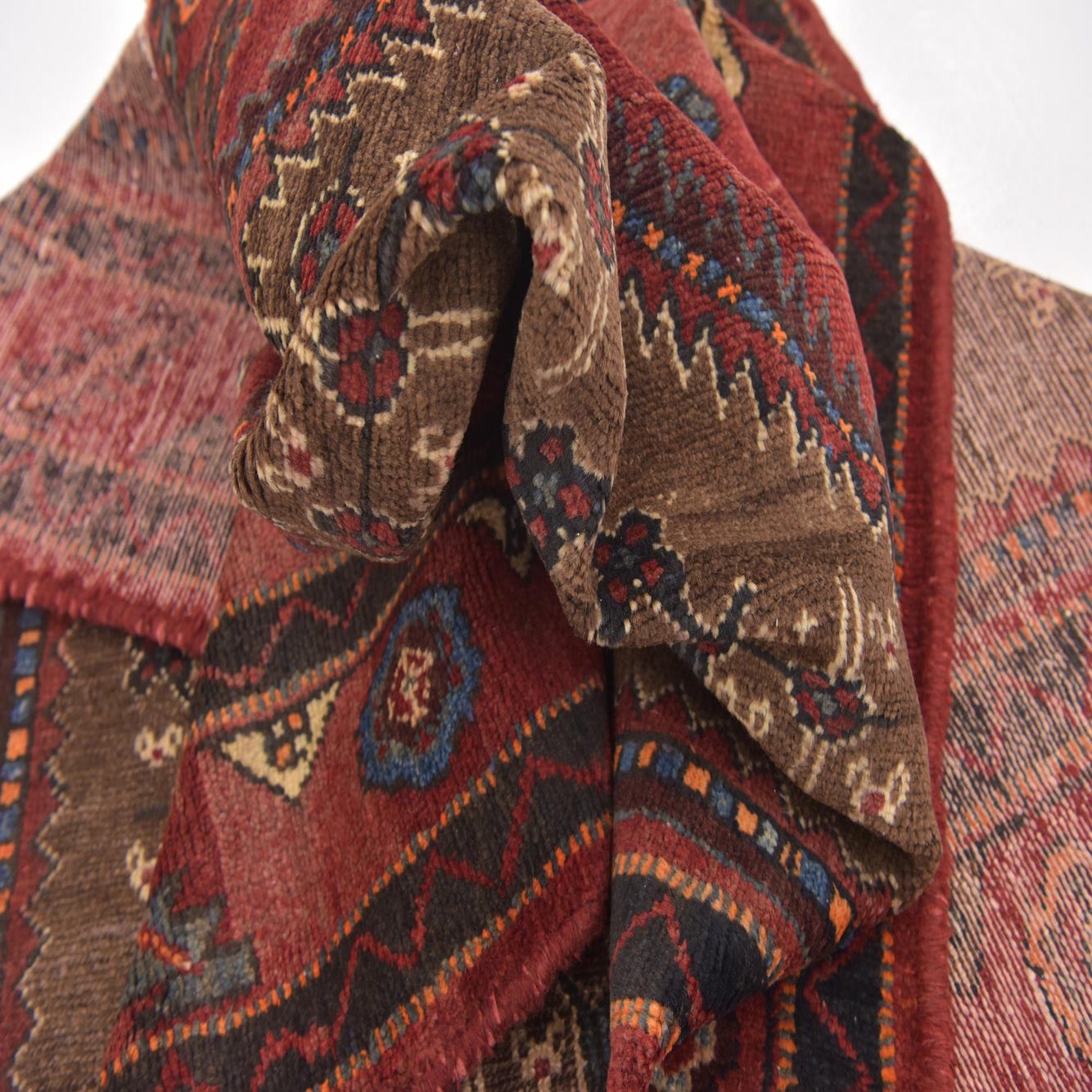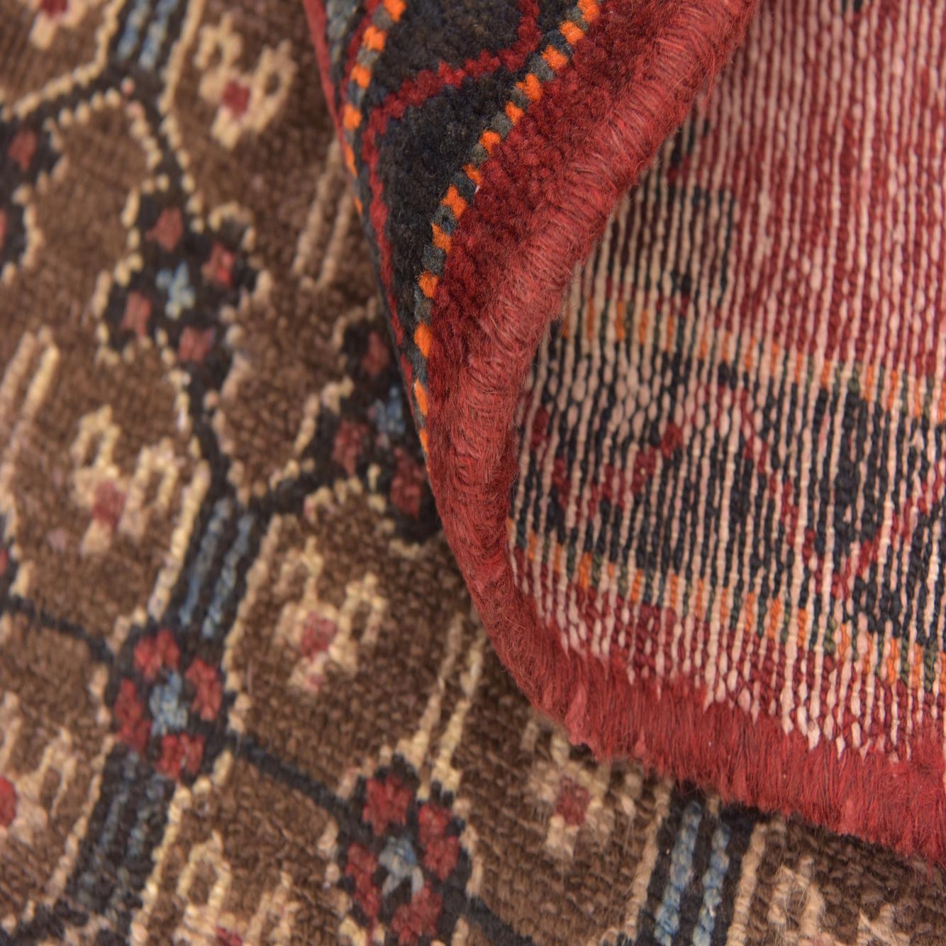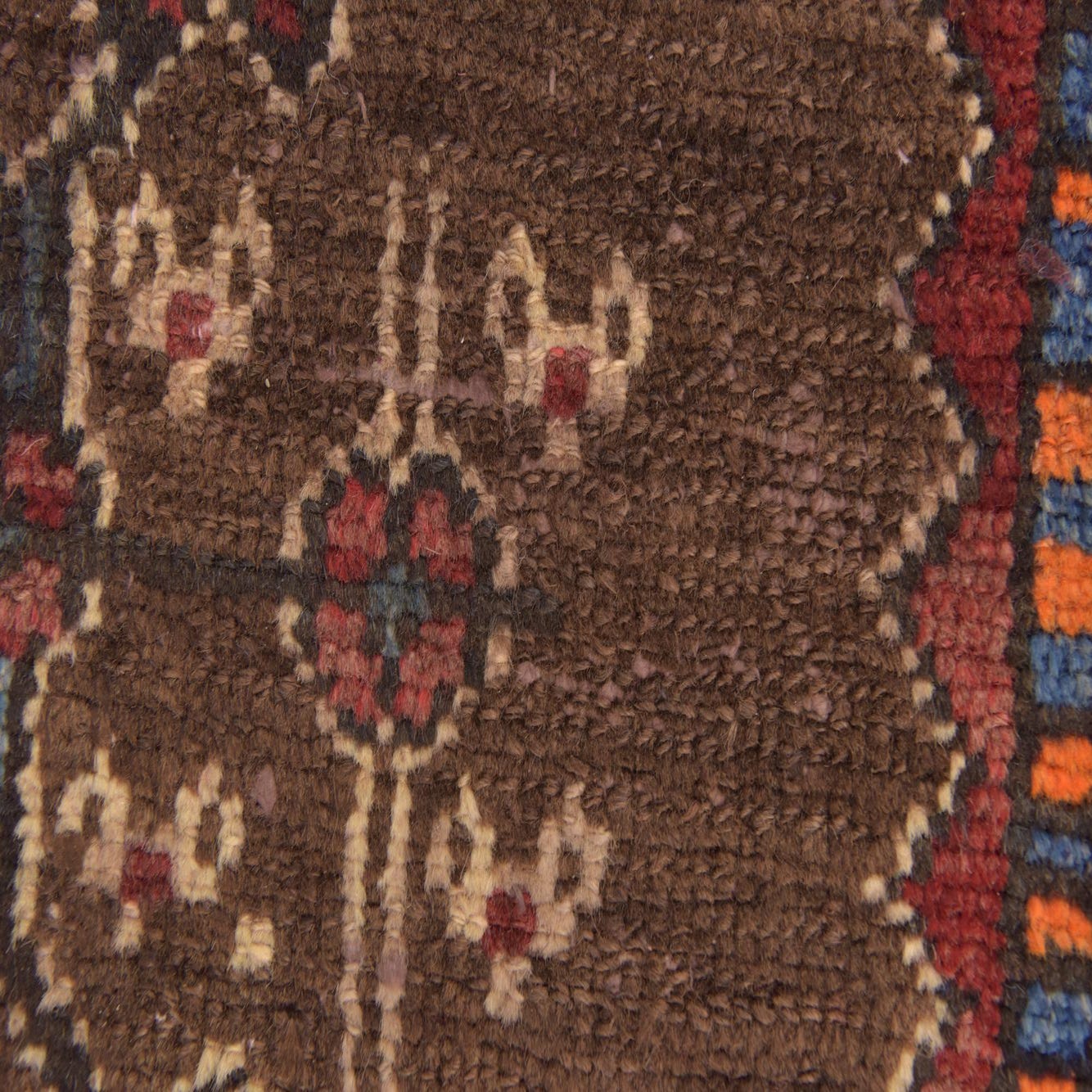 Primary color is Brown. Colors in this rug include: Brown, Beige, Black, Blue, Burgundy, Ivory.