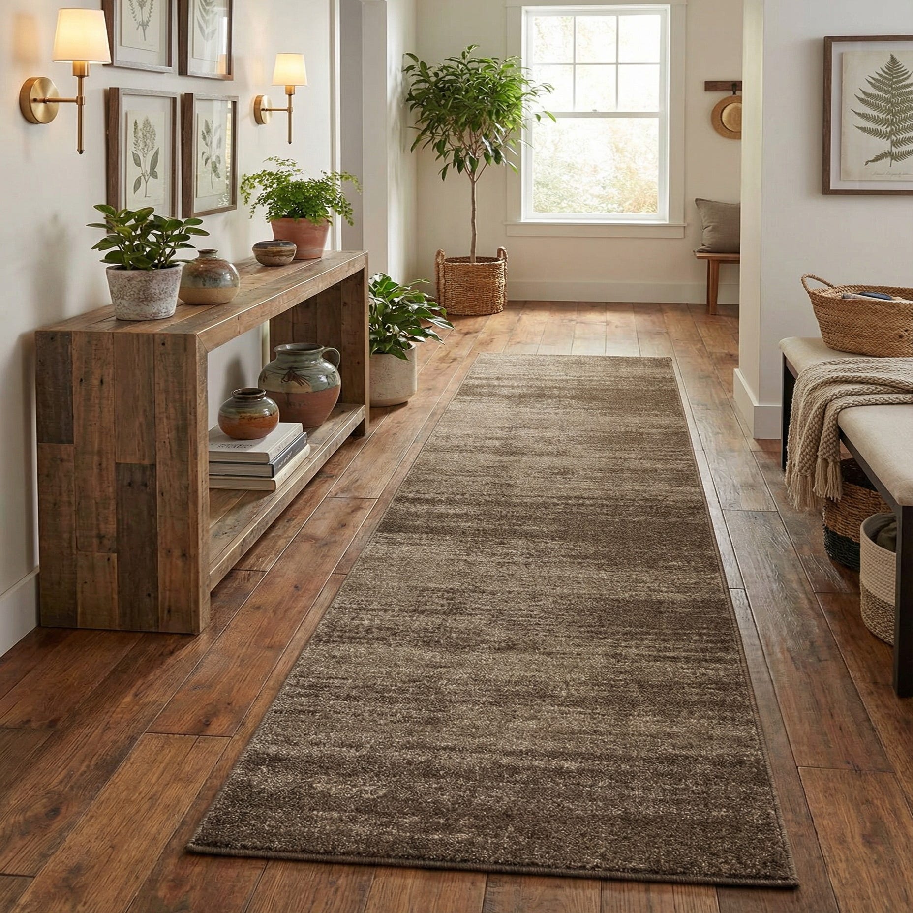 Primary color is Brown. Colors in this rug include: Brown, Beige.