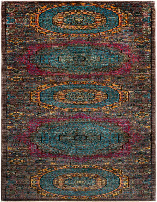 Primary color is Brown. Colors in this rug include: Brown, Brown, Blue, Yellow, Pink, Black.