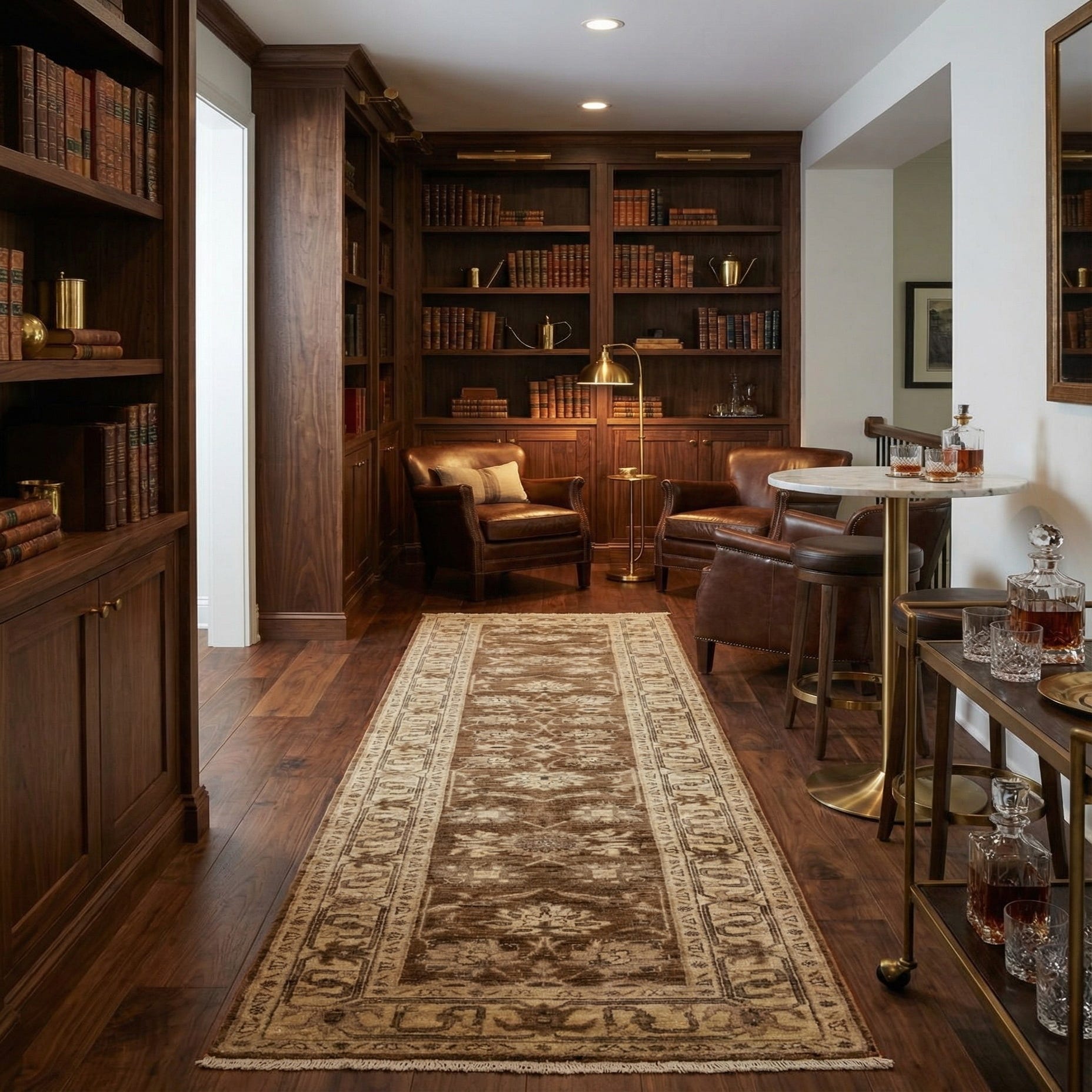 Primary color is Brown. Colors in this rug include: Brown, Light Brown.