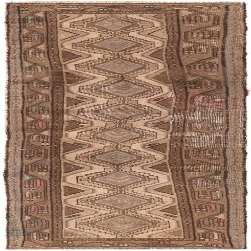 Primary color is Brown. Colors in this rug include: Brown, Black, Ivory, Rust Red, Navy Blue.
