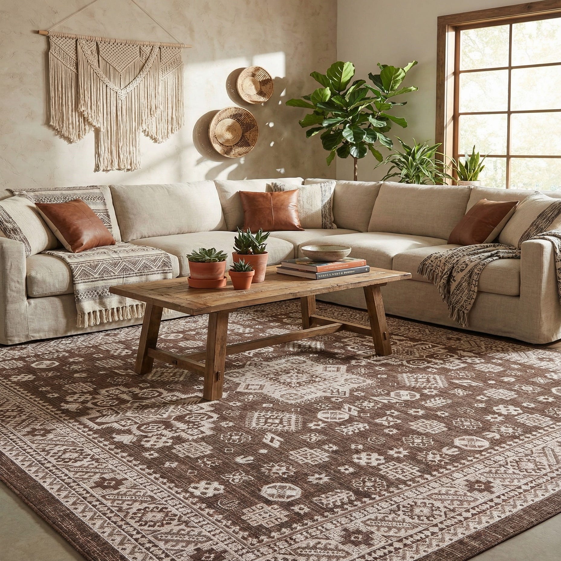 Primary color is Brown. Colors in this rug include: Brown, Gray, Ivory.