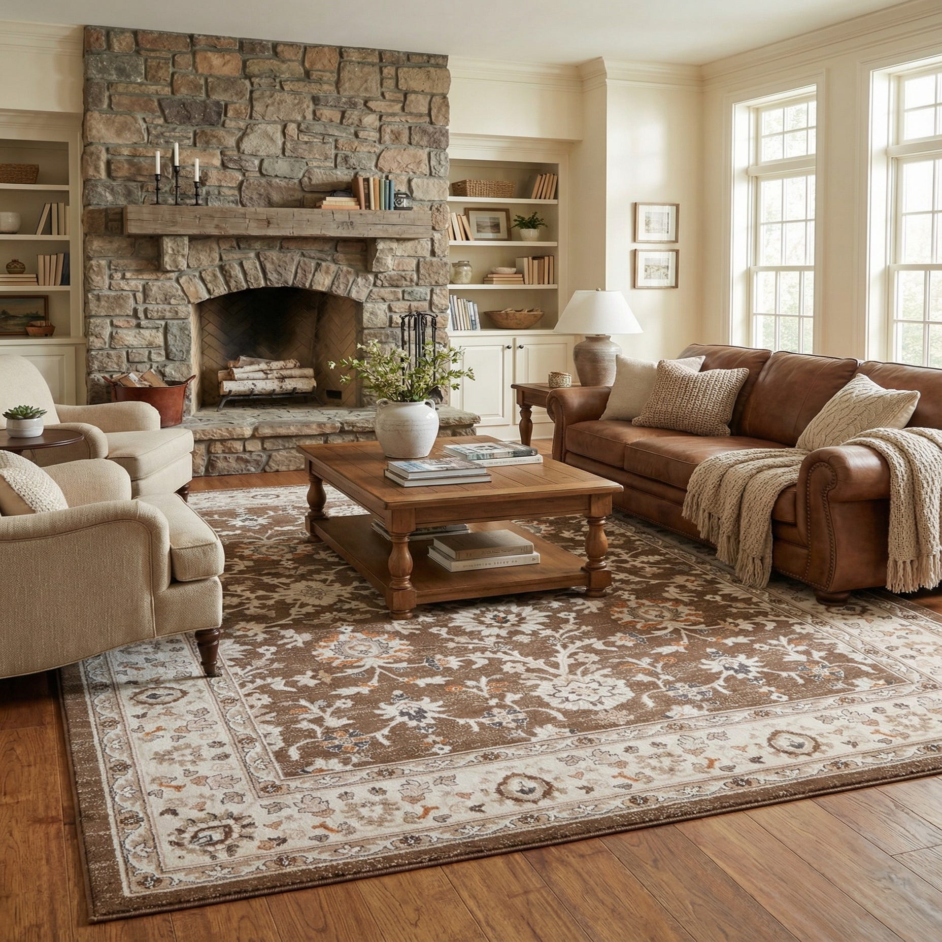 Primary color is Brown. Colors in this rug include: Brown, Gray, Ivory, Light Brown, Terracotta.