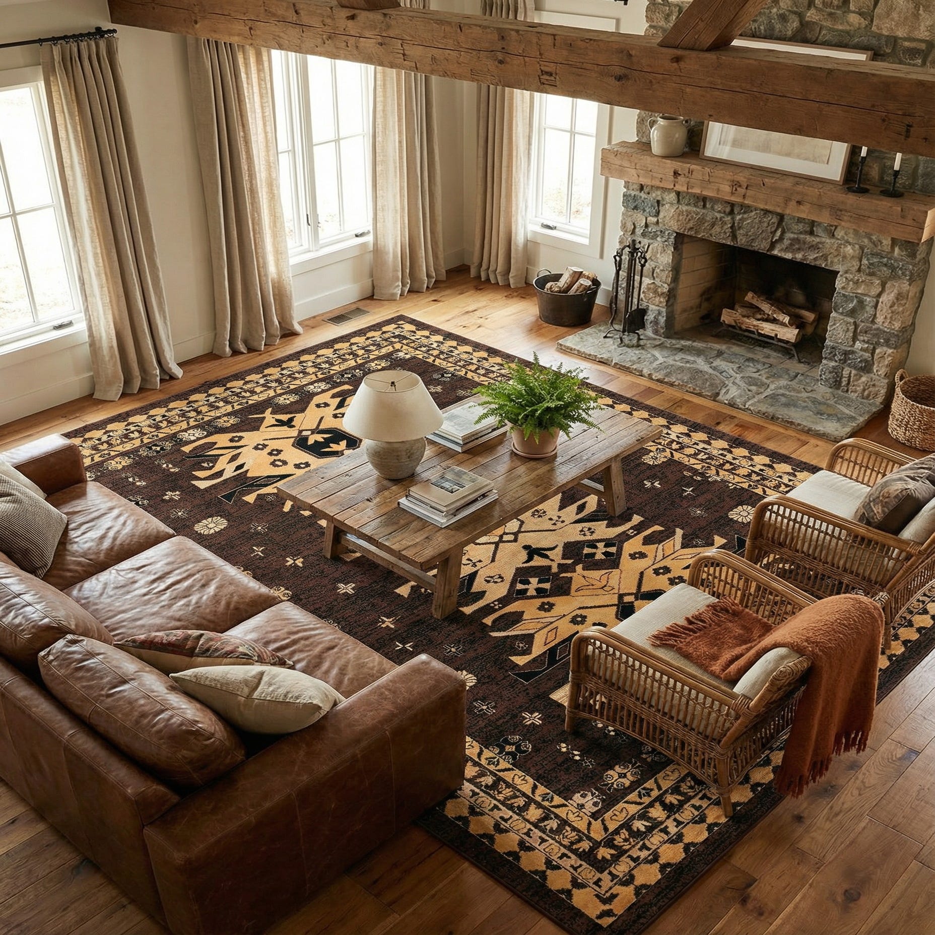 Primary color is Brown. Colors in this rug include: Brown, Black, Cream.