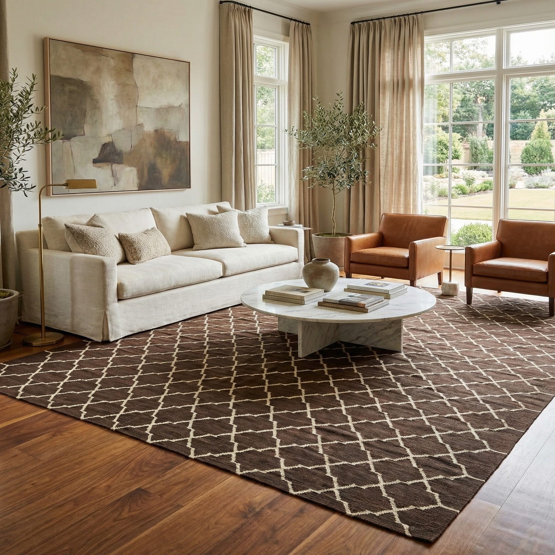 Primary color is Brown. Colors in this rug include: Brown, Beige.