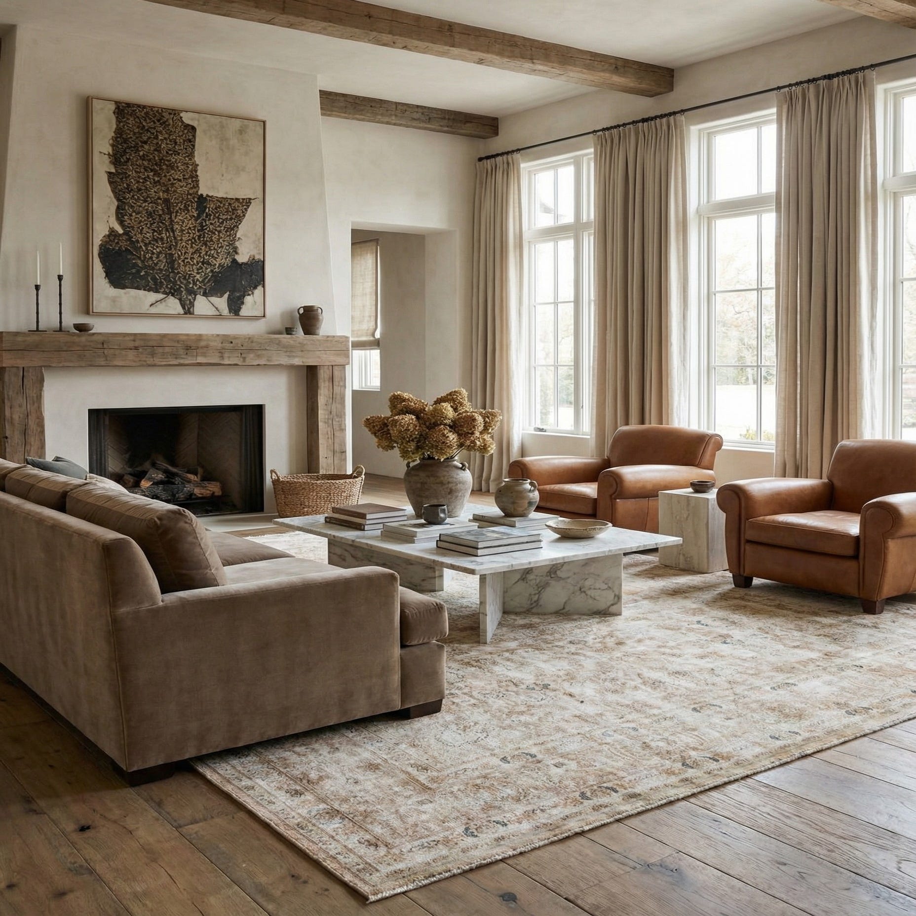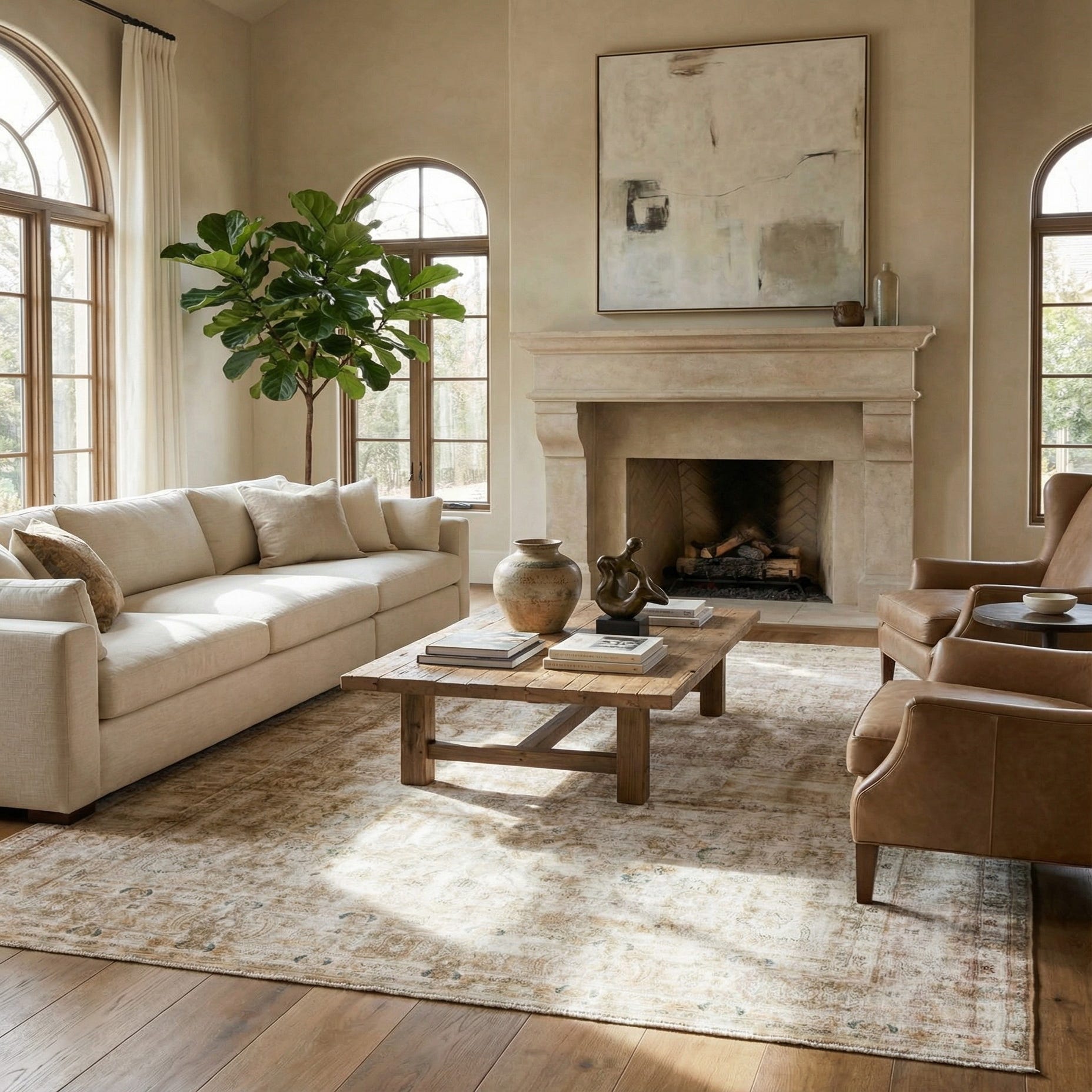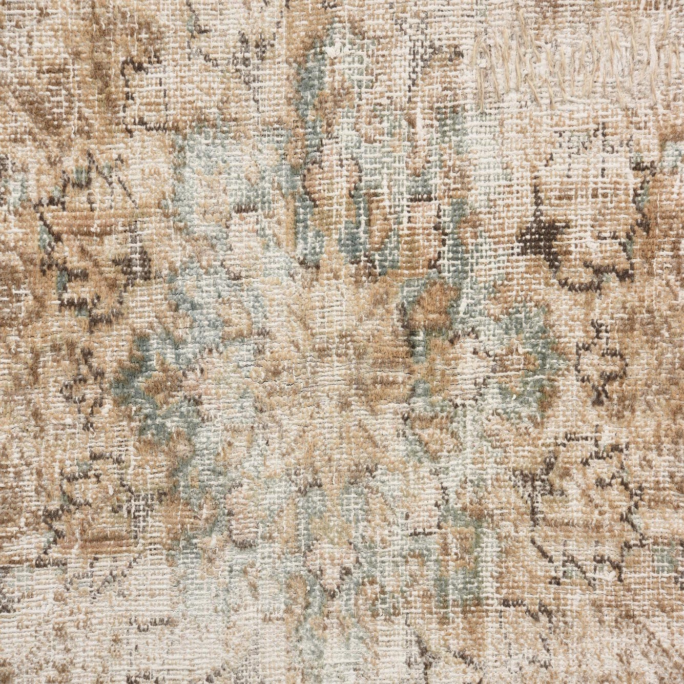 Primary color is Brown. Colors in this rug include: Brown, Beige, Ivory, Green.