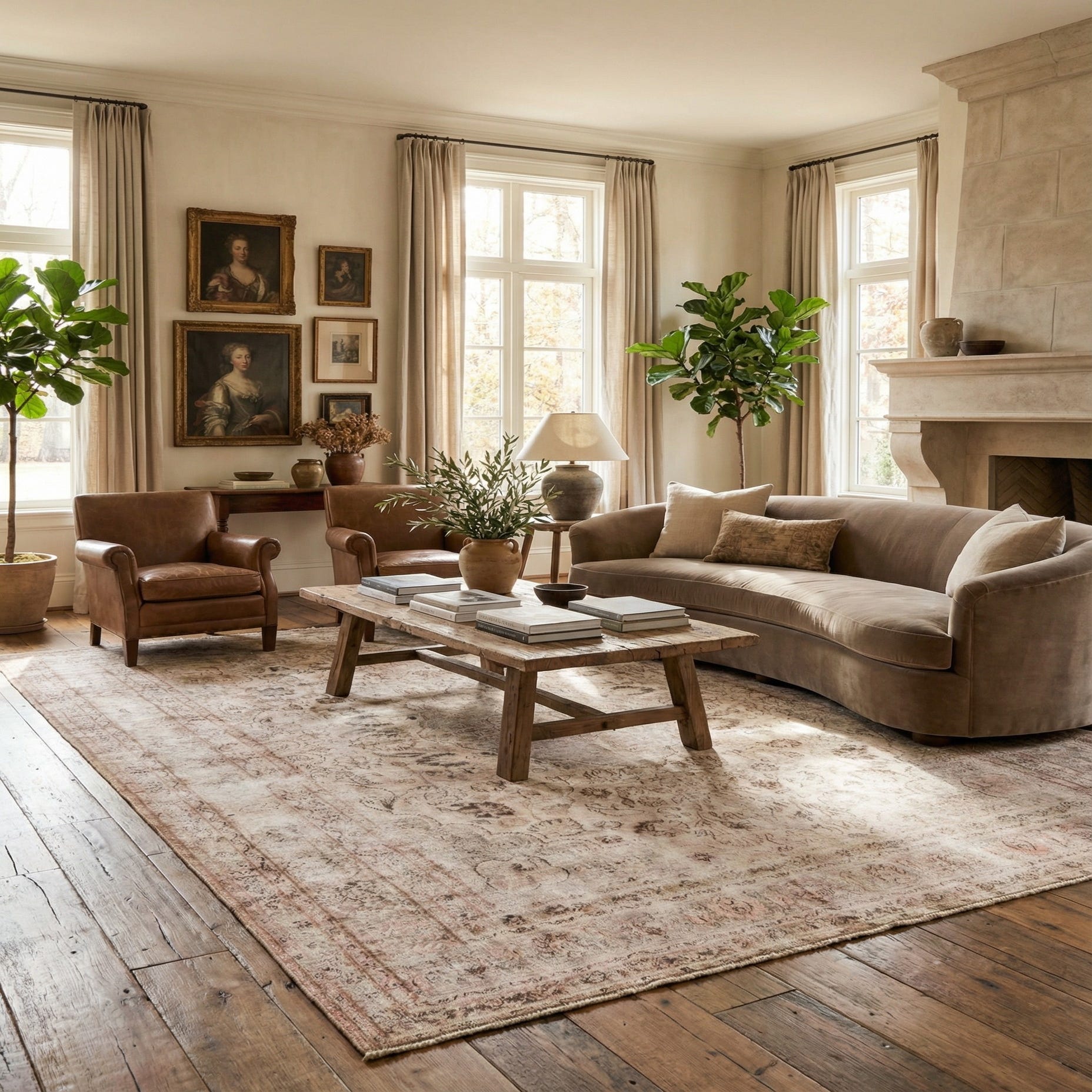 Primary color is Brown. Colors in this rug include: Brown, Beige, Ivory, Navy Blue, Pink.