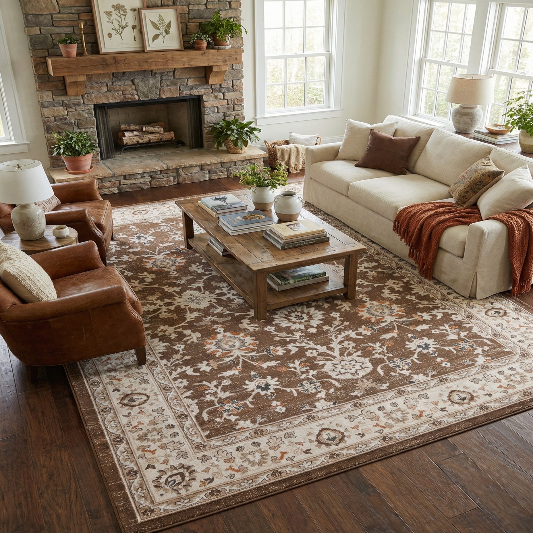 Primary color is Brown. Colors in this rug include: Brown, Gray, Ivory, Light Brown, Terracotta.