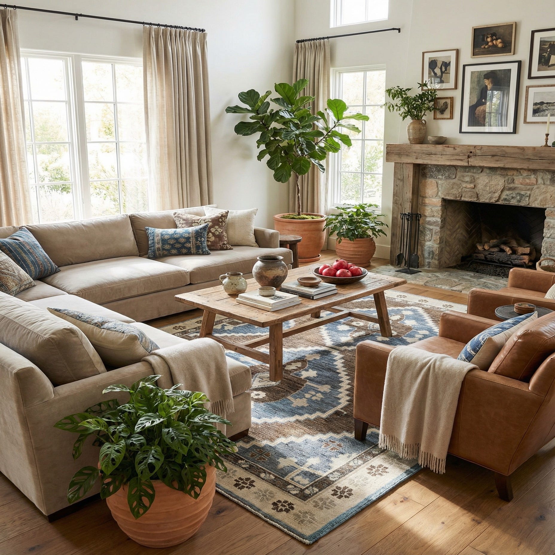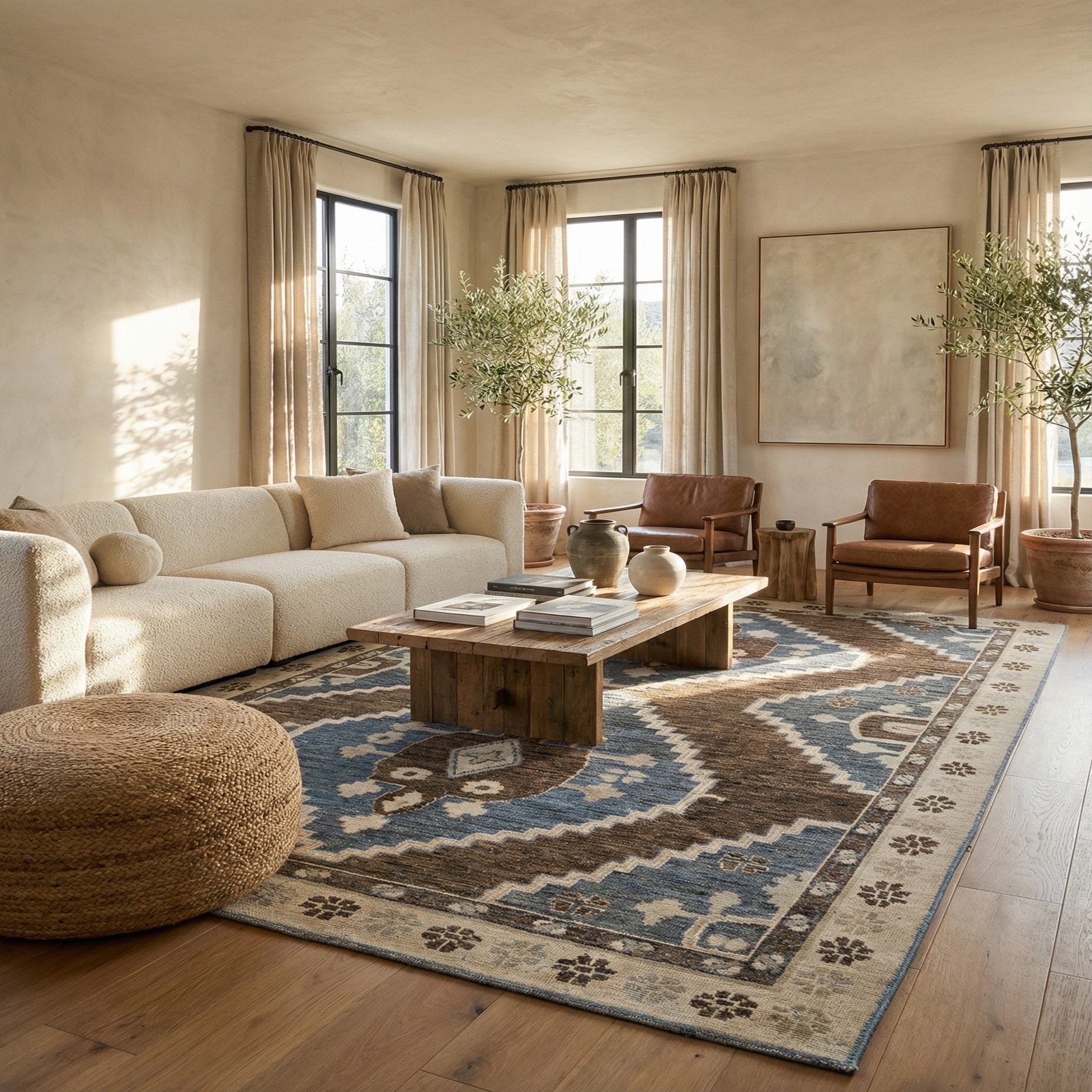 Primary color is Brown. Colors in this rug include: Brown, Navy Blue, Light Blue, Ivory.