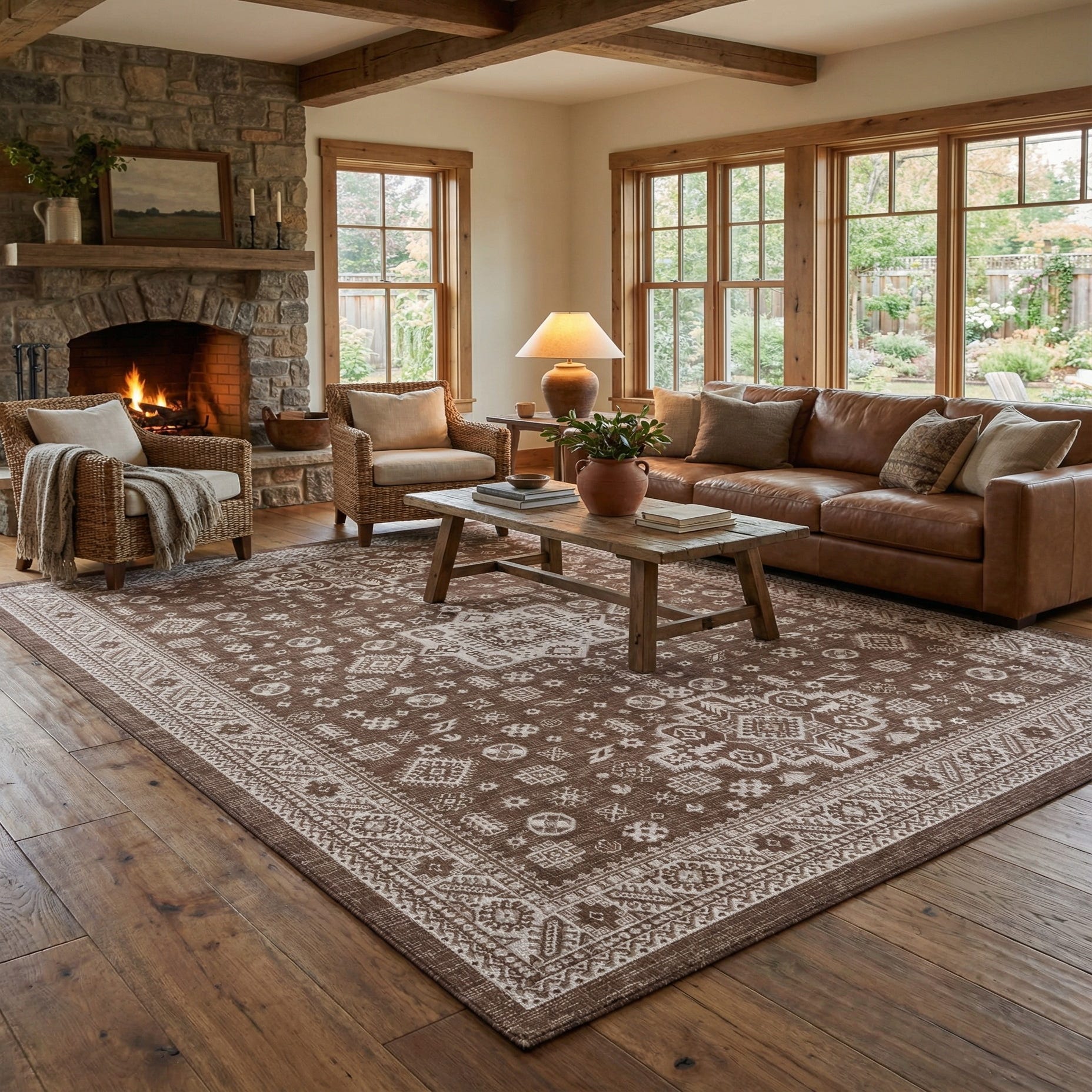 Primary color is Brown. Colors in this rug include: Brown, Ivory.