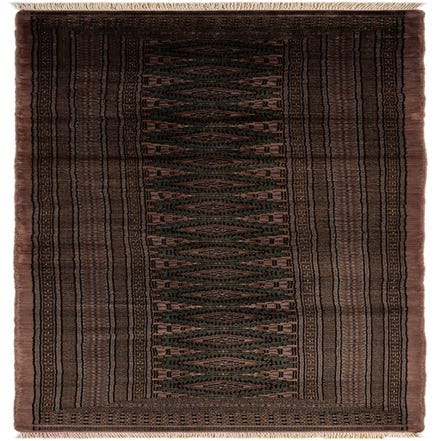 Primary color is Brown. Colors in this rug include: Brown, Black, Green, Red, Light Brown.
