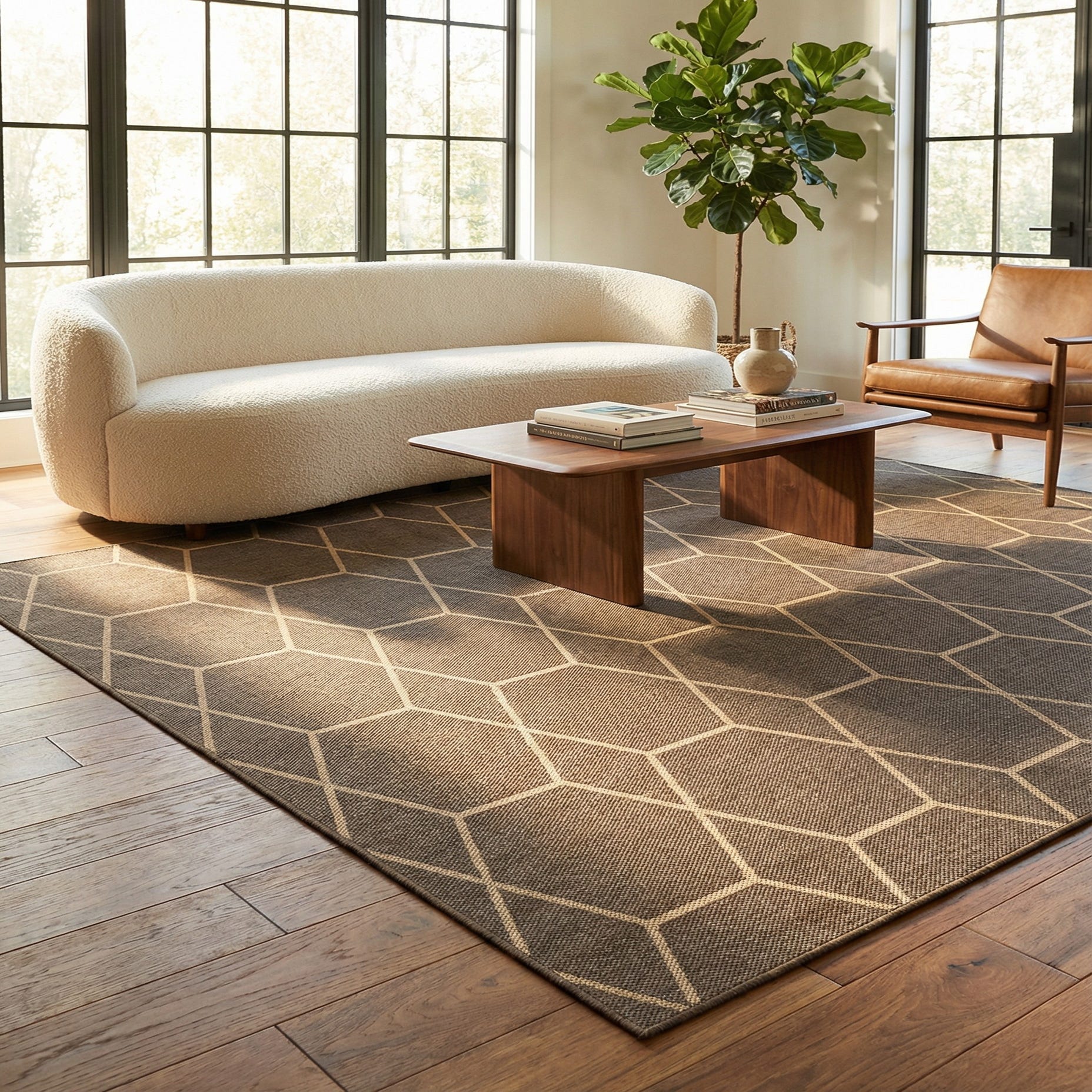 Primary color is Brown. Colors in this rug include: Brown, Natural.