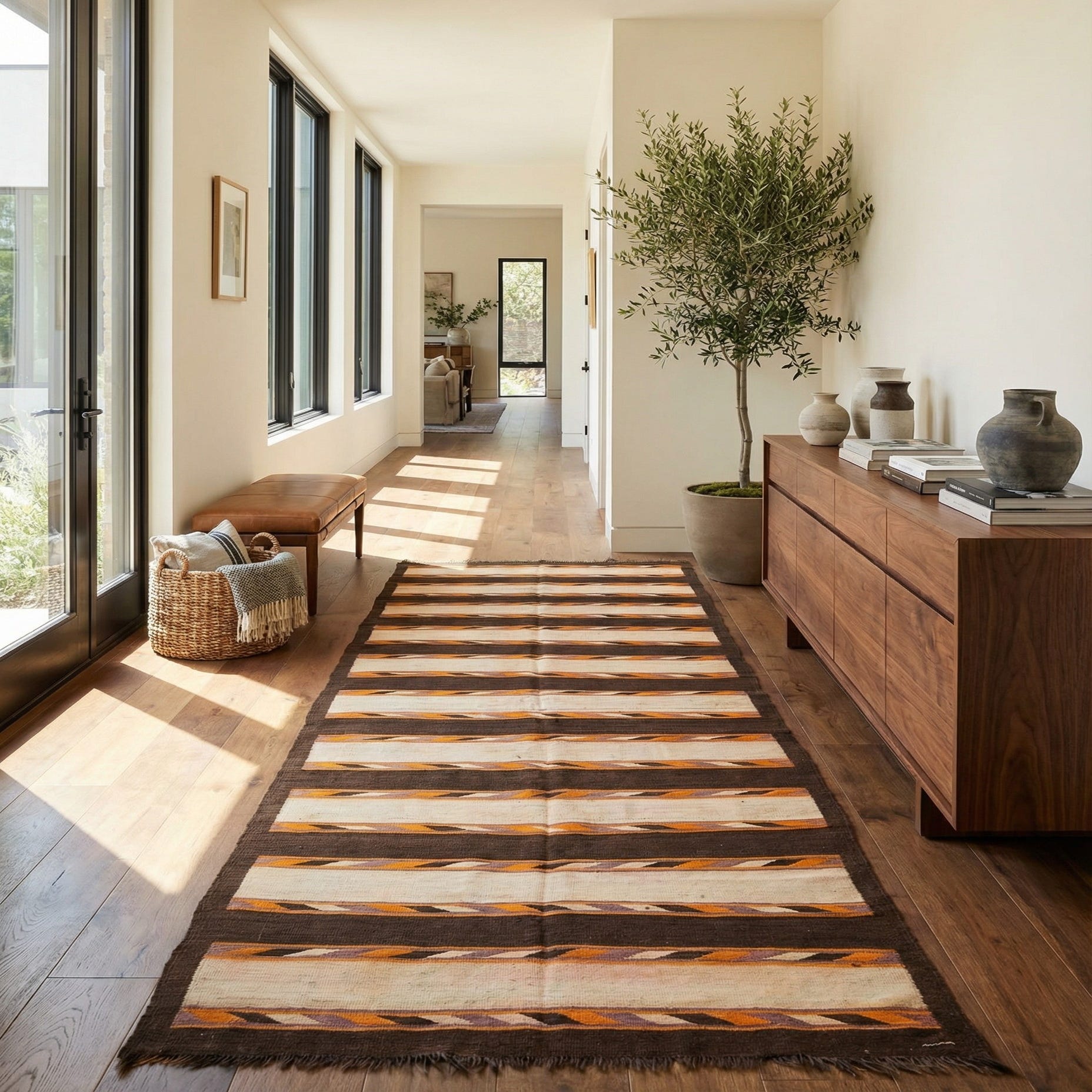 Primary color is Brown. Colors in this rug include: Brown, Beige, Orange.