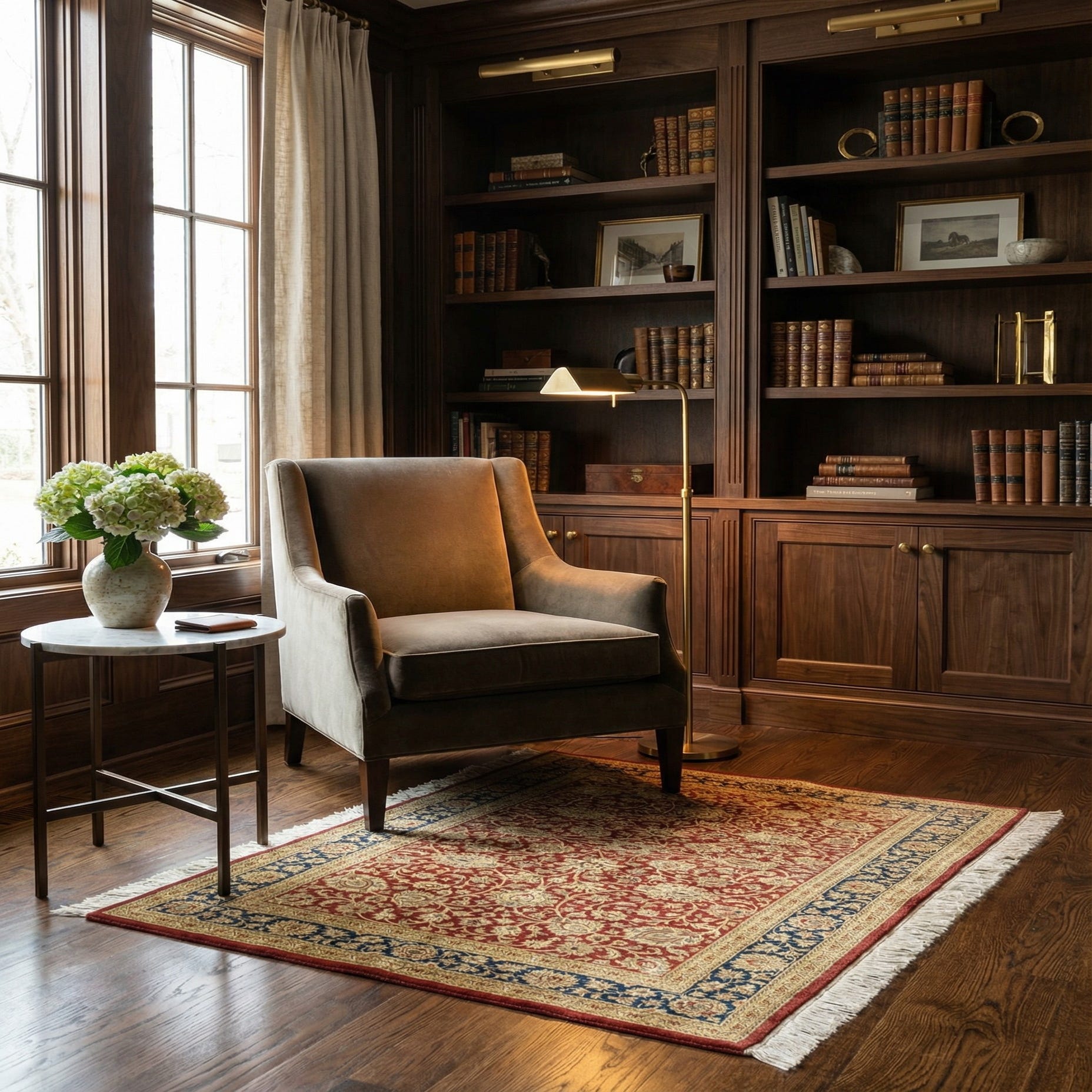 Primary color is Brown. Colors in this rug include: Brown, Brown, Beige, Olive, Blue.