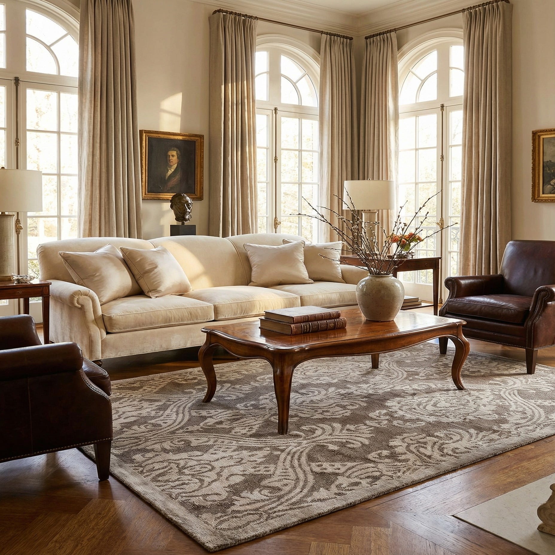 Primary color is Brown. Colors in this rug include: Brown, Gray.