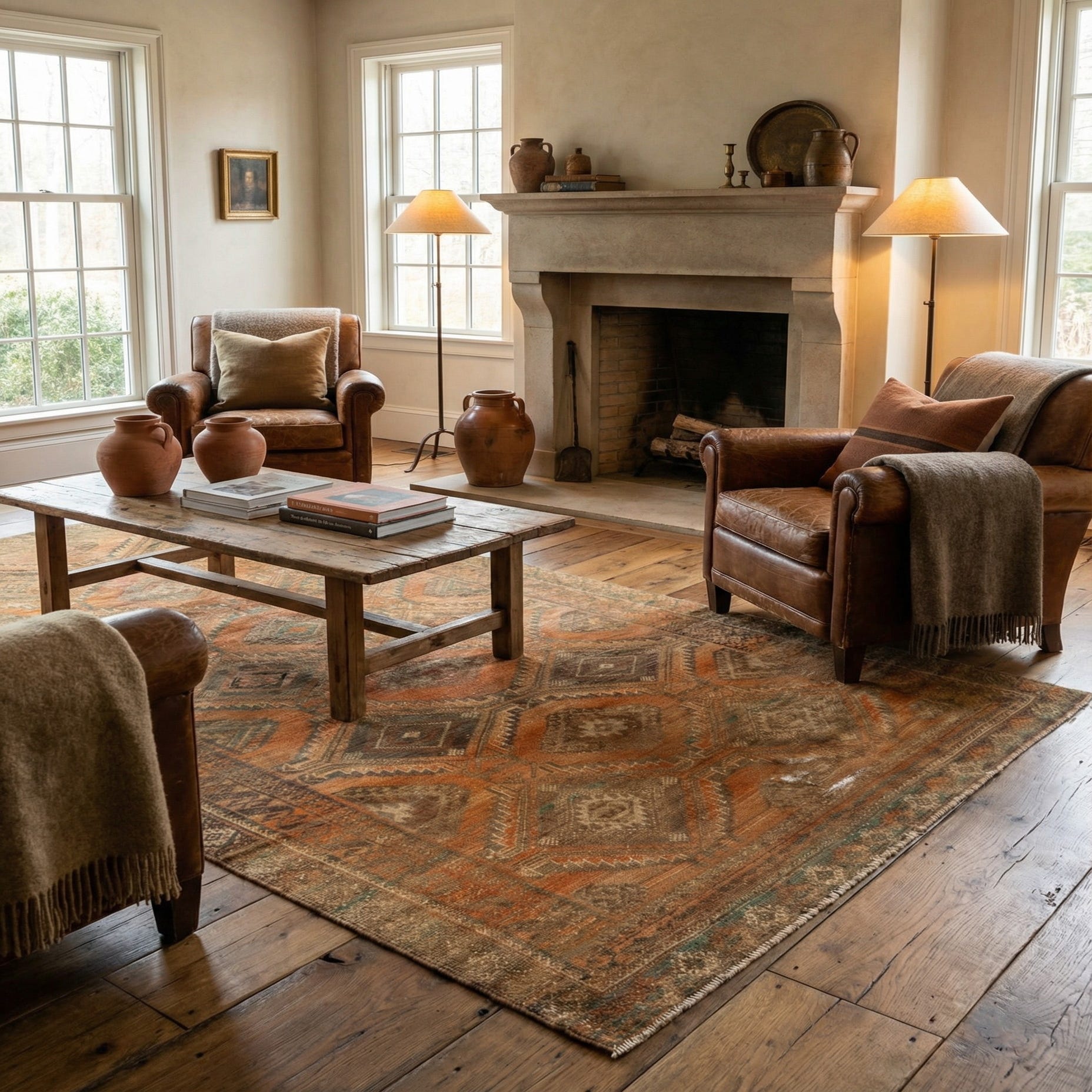 Primary color is Brown. Colors in this rug include: Brown, Orange, Olive.