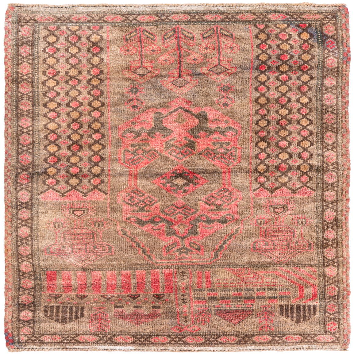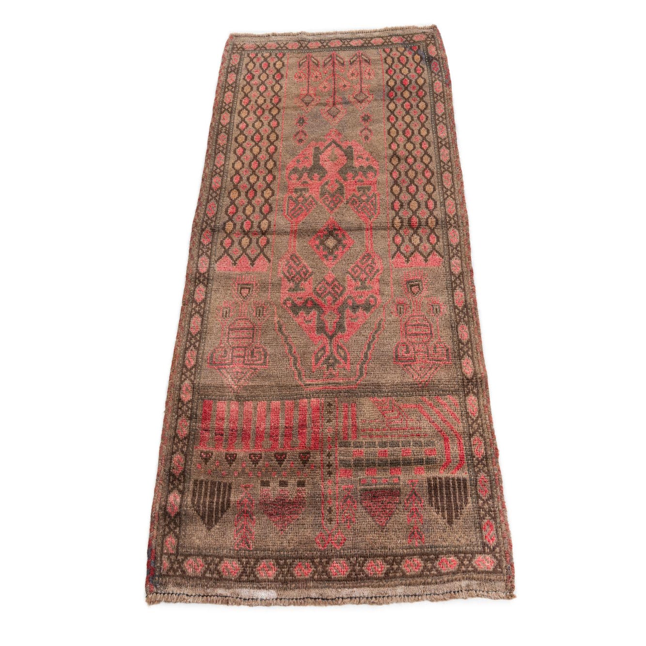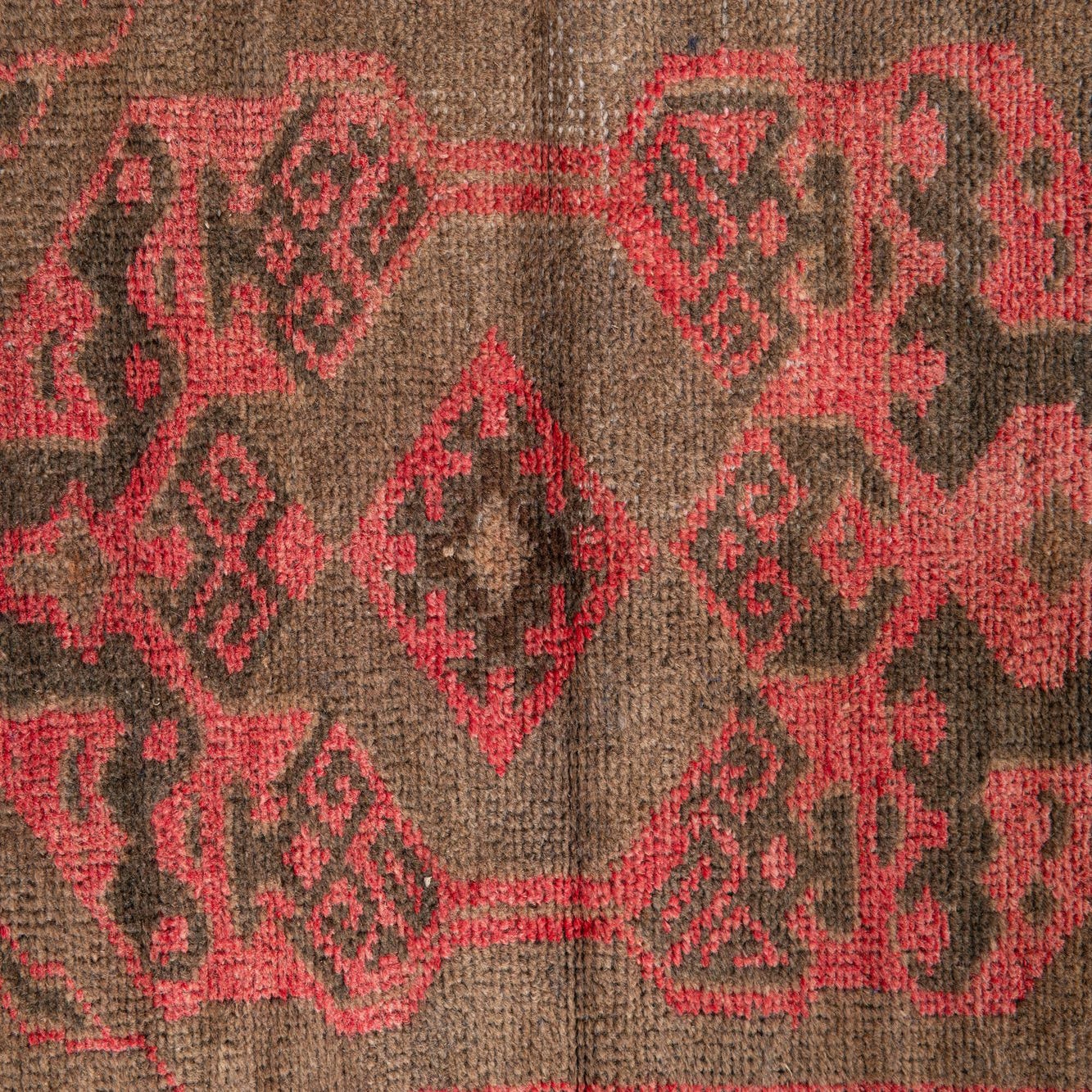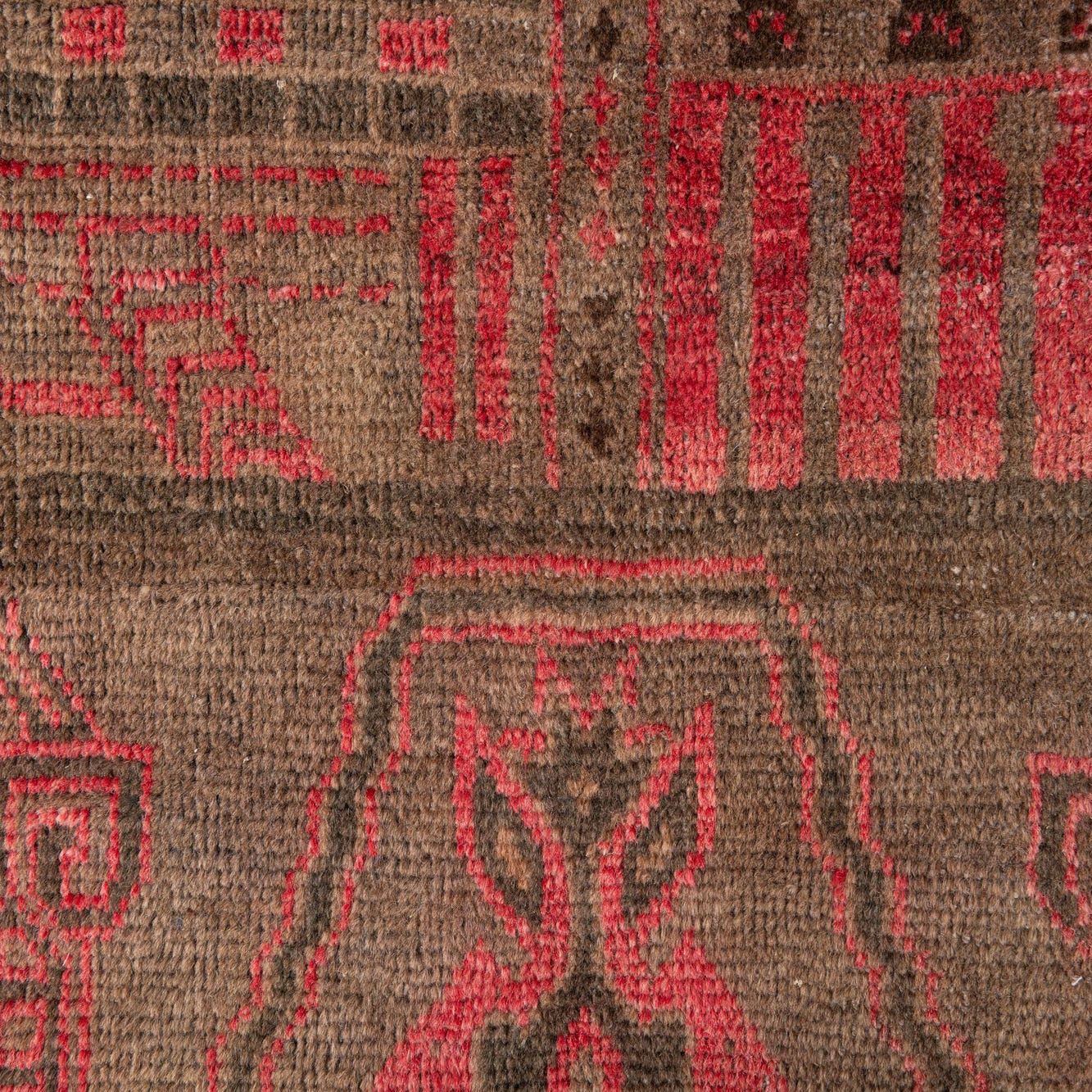 Primary color is Brown. Colors in this rug include: Brown, Red.