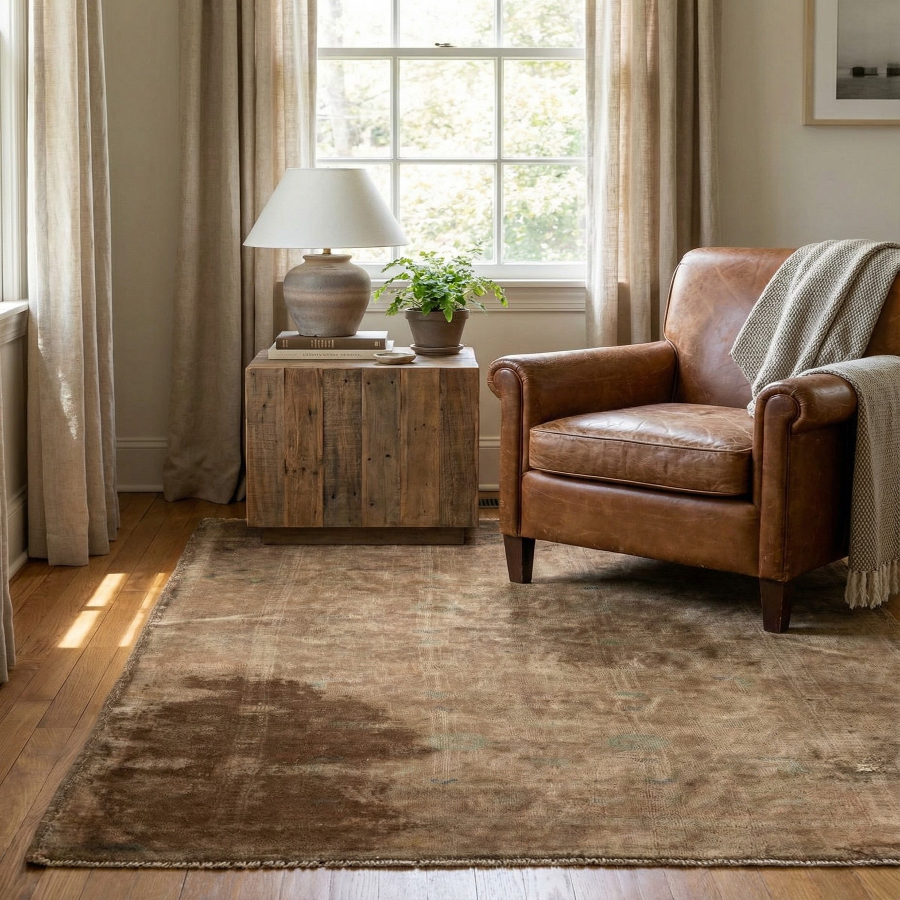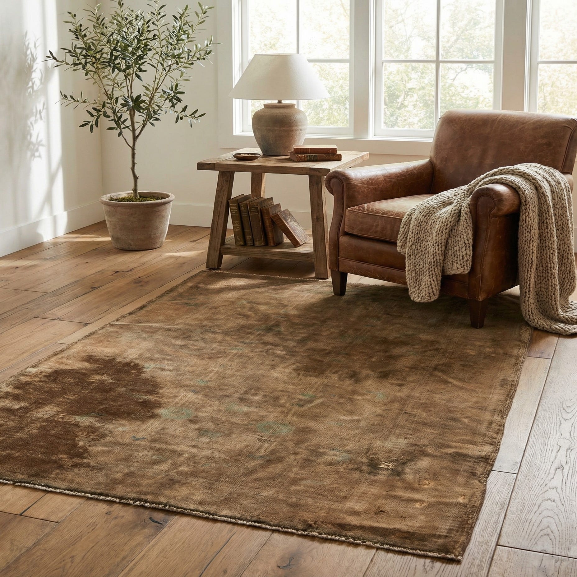 Primary color is Brown. Colors in this rug include: Brown, Beige, Green.