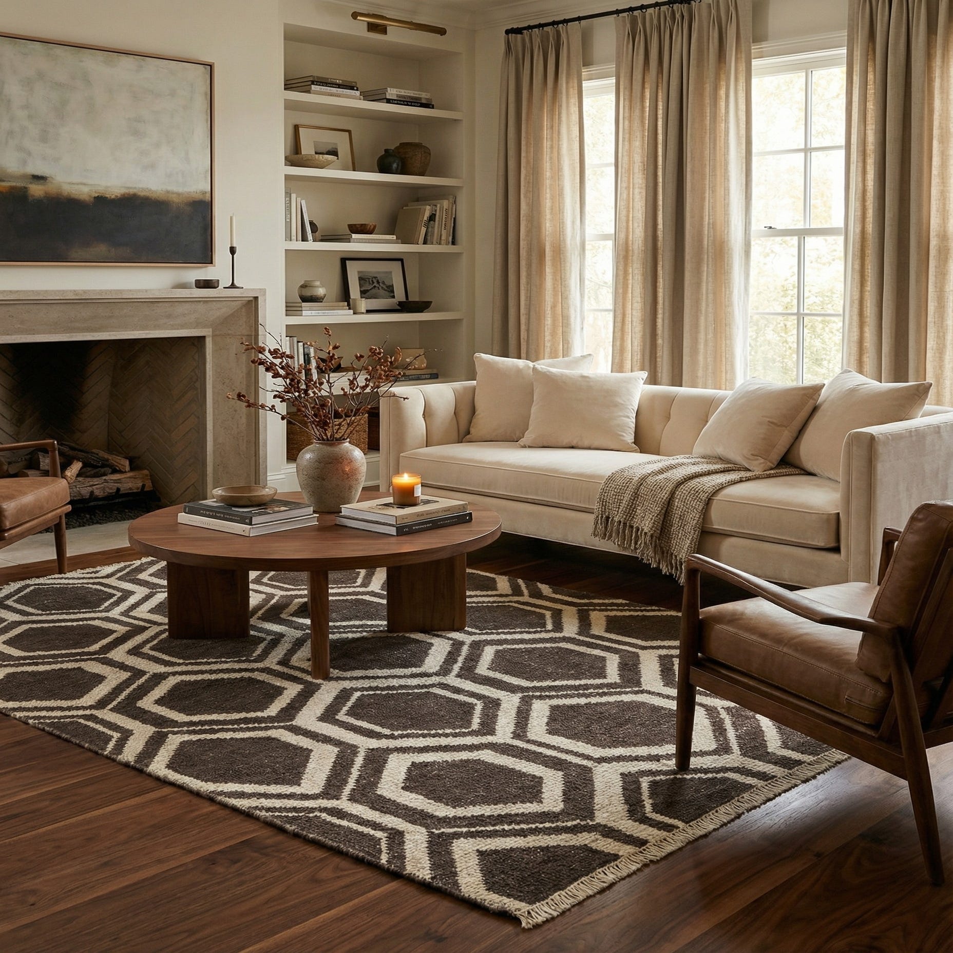 Primary color is Brown. Colors in this rug include: Brown, Ivory.