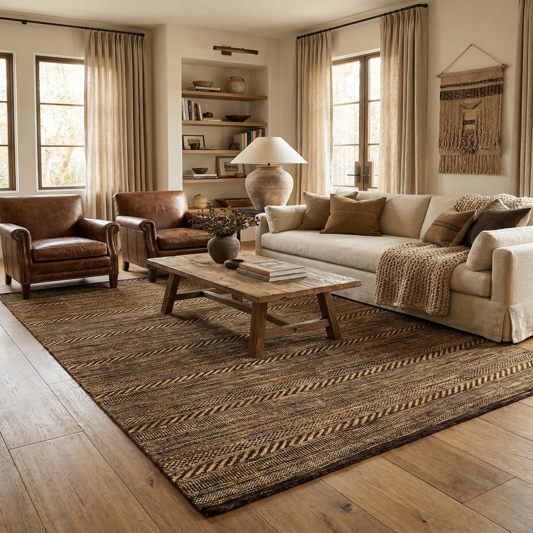 Primary color is Brown. Colors in this rug include: Brown, Brown, Cream, Beige.