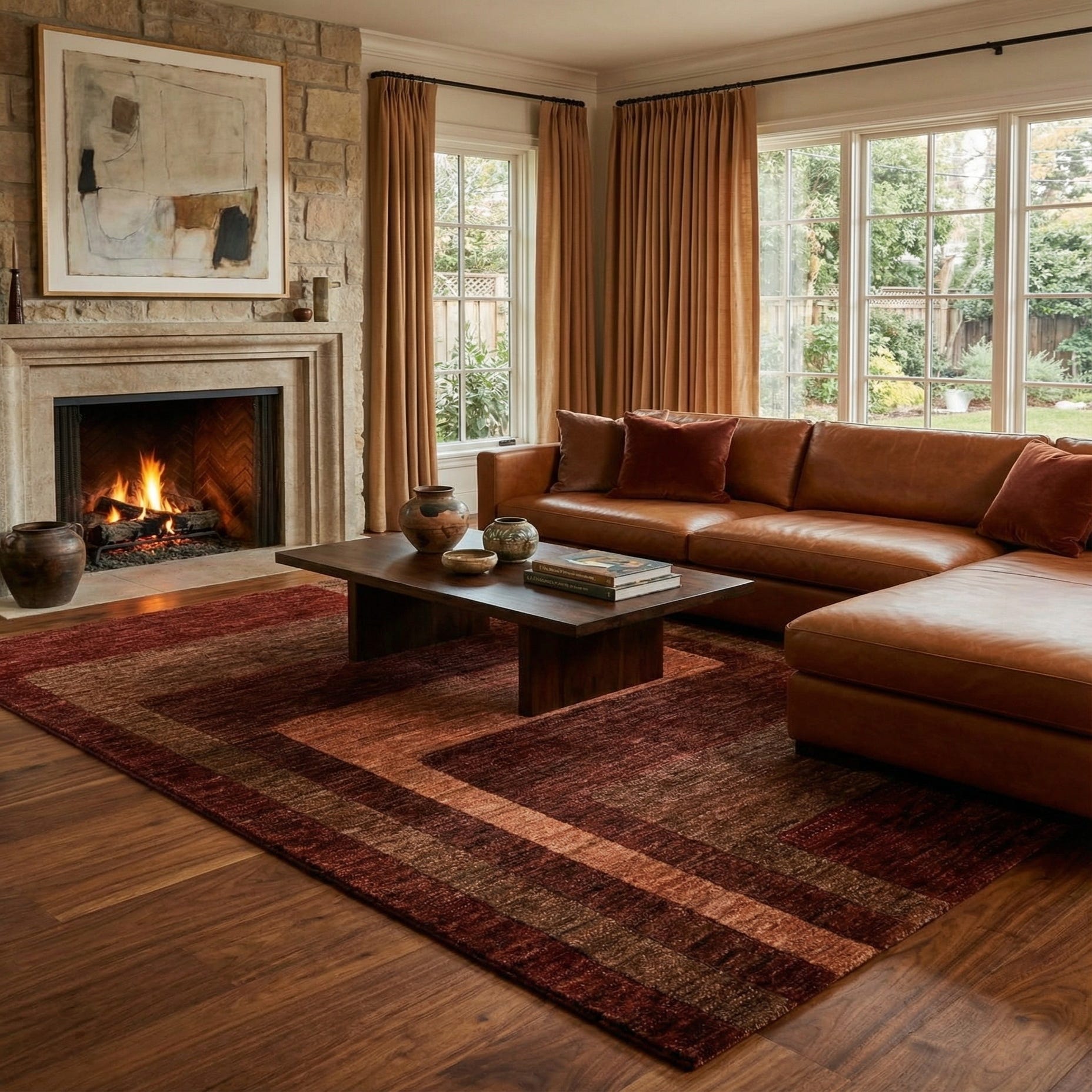 Primary color is Brown. Colors in this rug include: Brown, Brown, Burgundy, Beige.