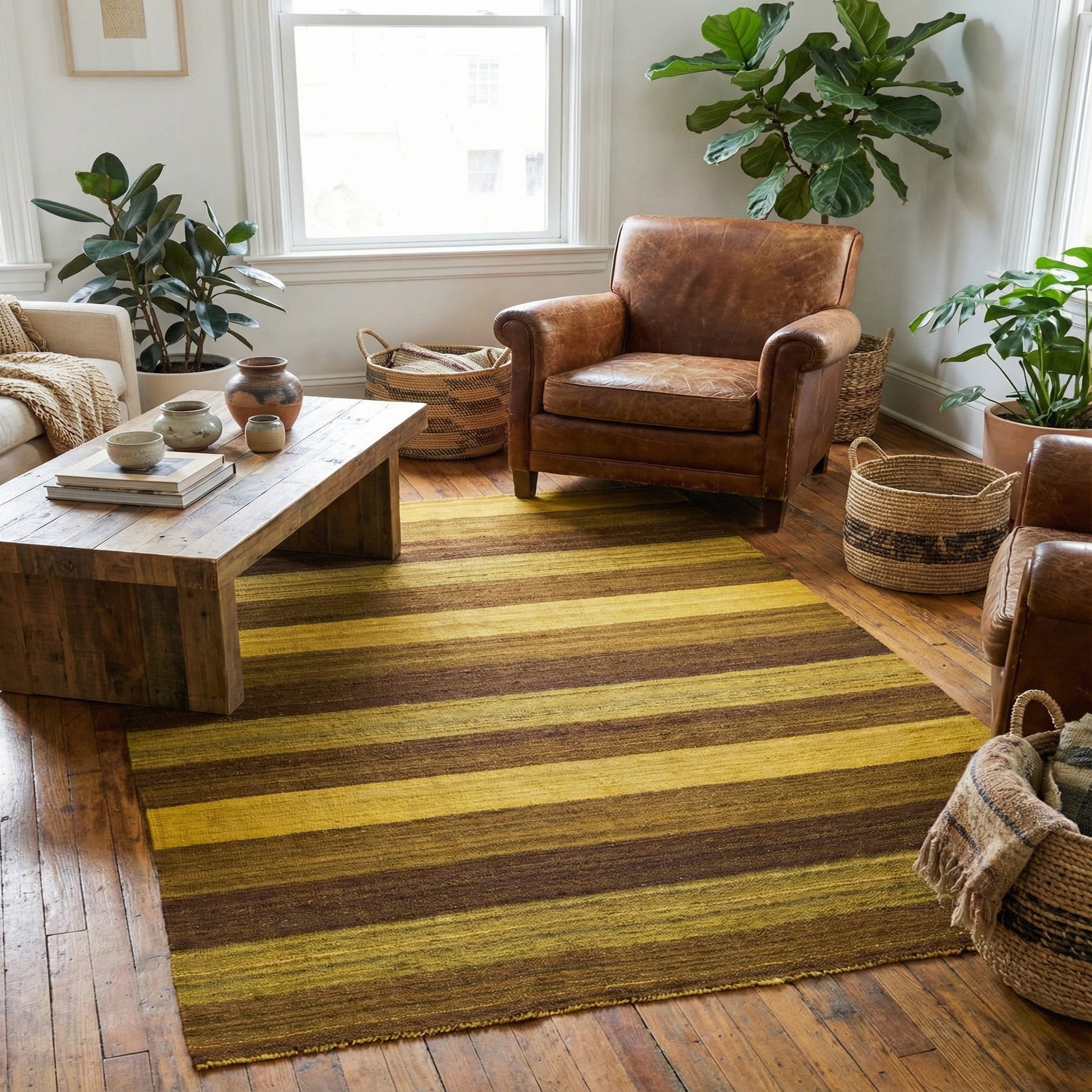 Primary color is Brown. Colors in this rug include: Brown, Gold, Light Brown.