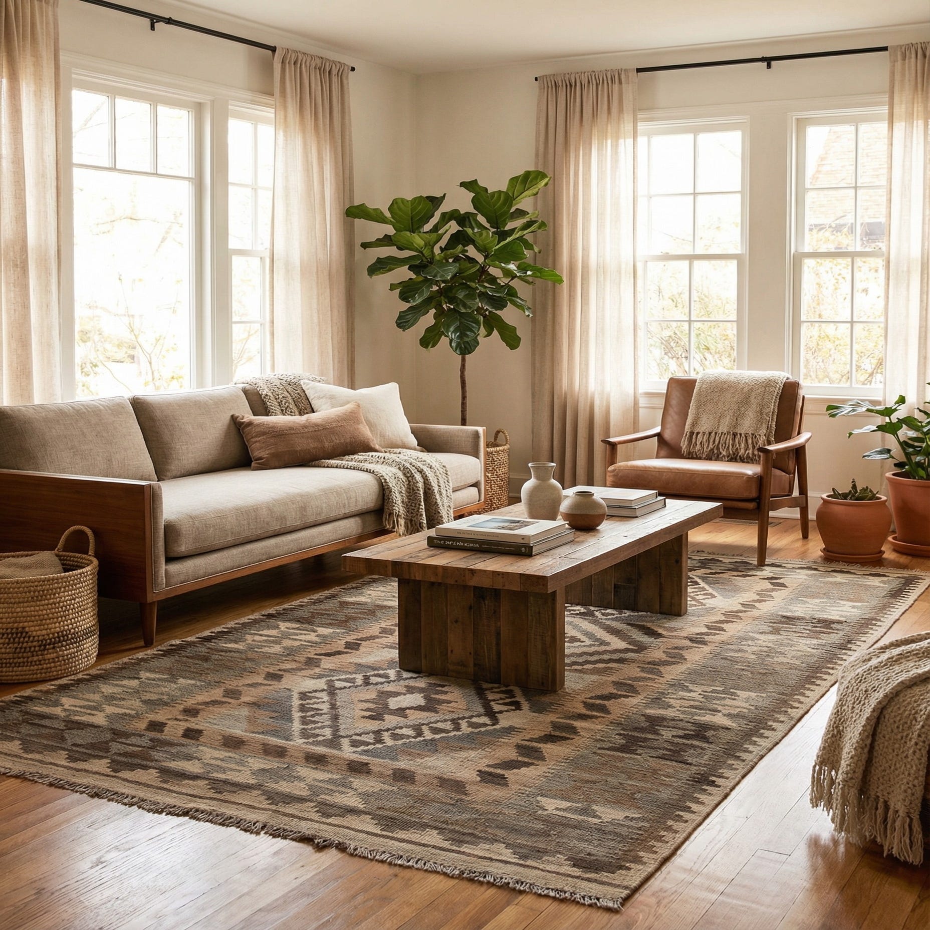 Primary color is Brown. Colors in this rug include: Brown, Beige, Cream, Gray, Light Brown.
