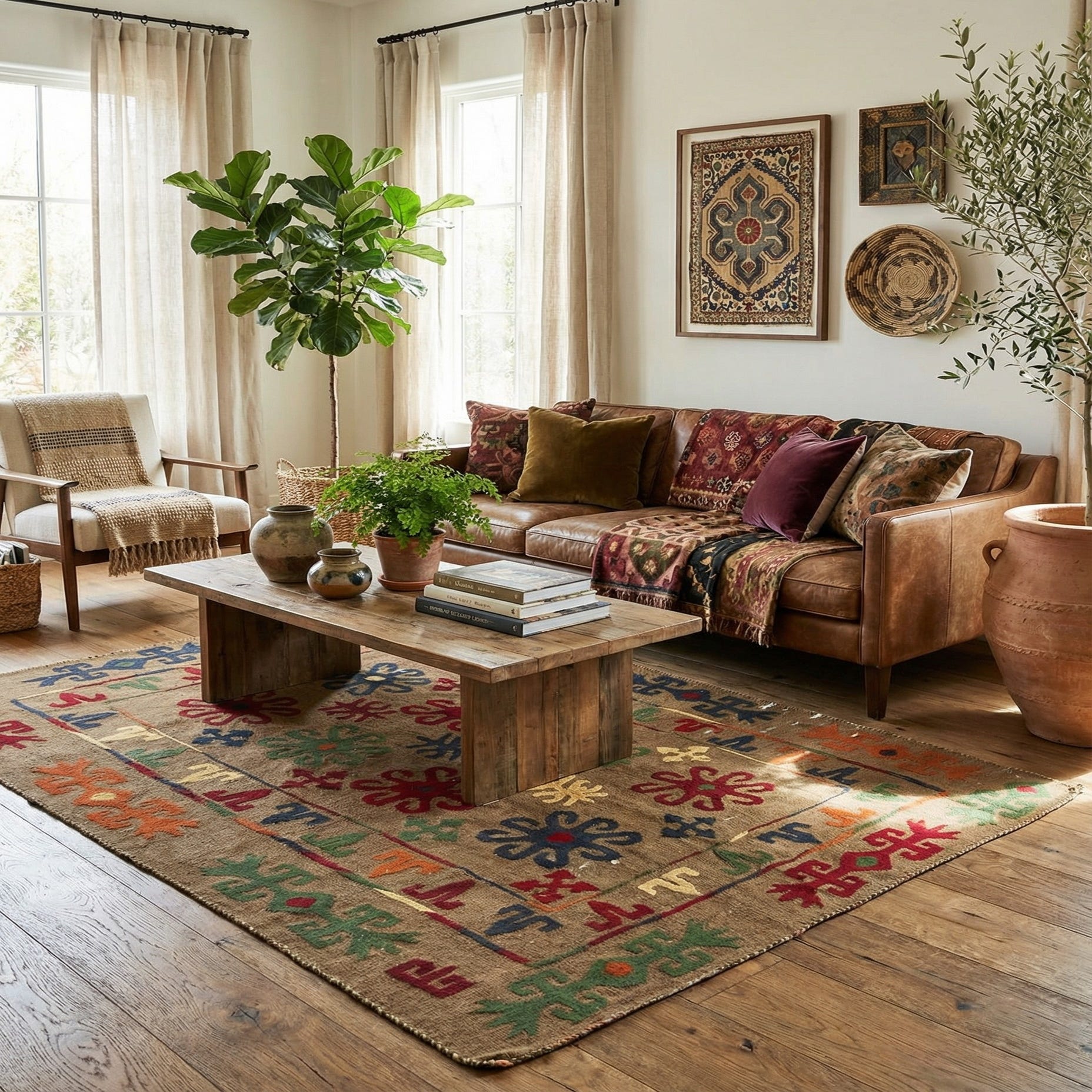Primary color is Brown. Colors in this rug include: Brown, Beige, Burgundy, Green, Orange, Navy Blue.