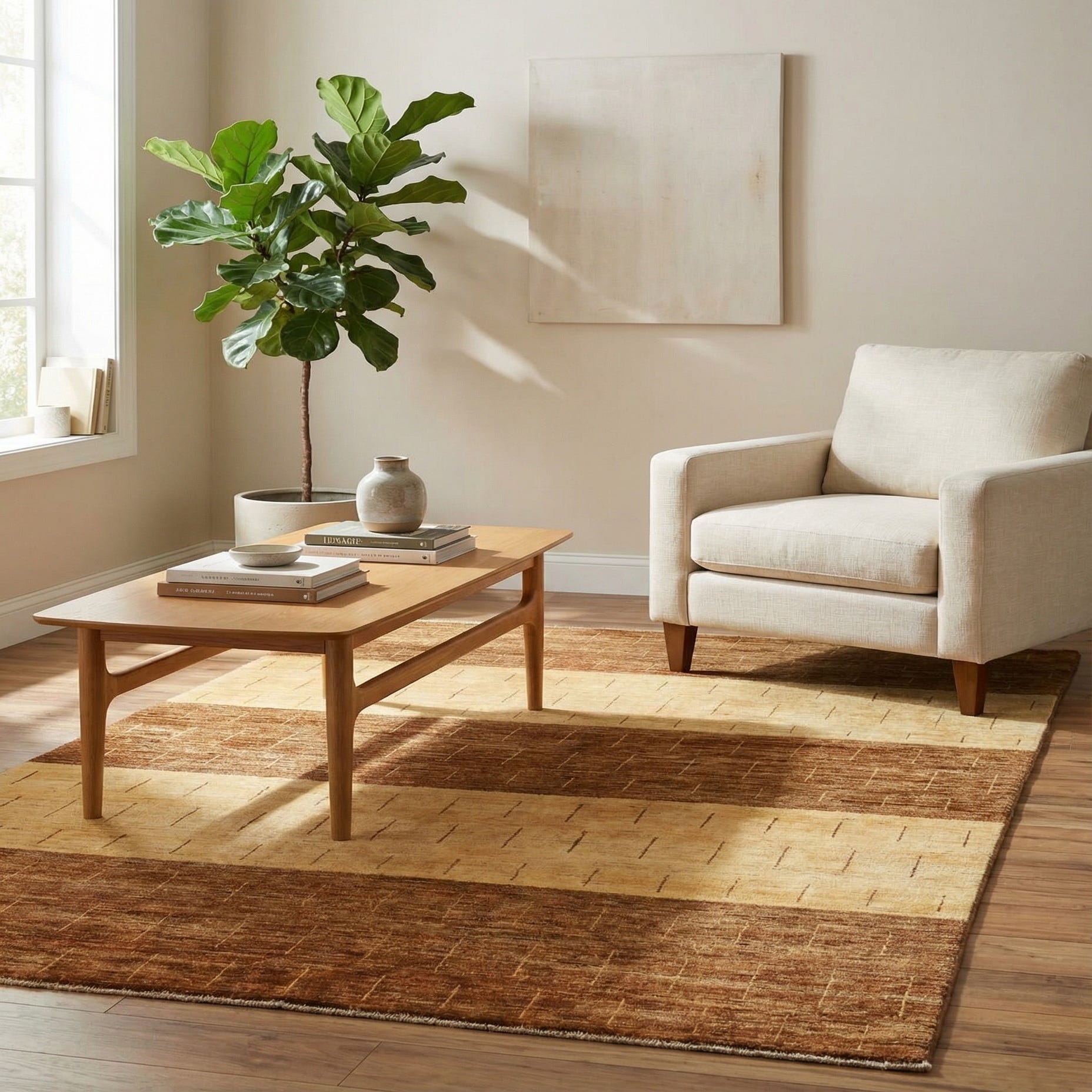 Primary color is Brown. Colors in this rug include: Brown, Tan.
