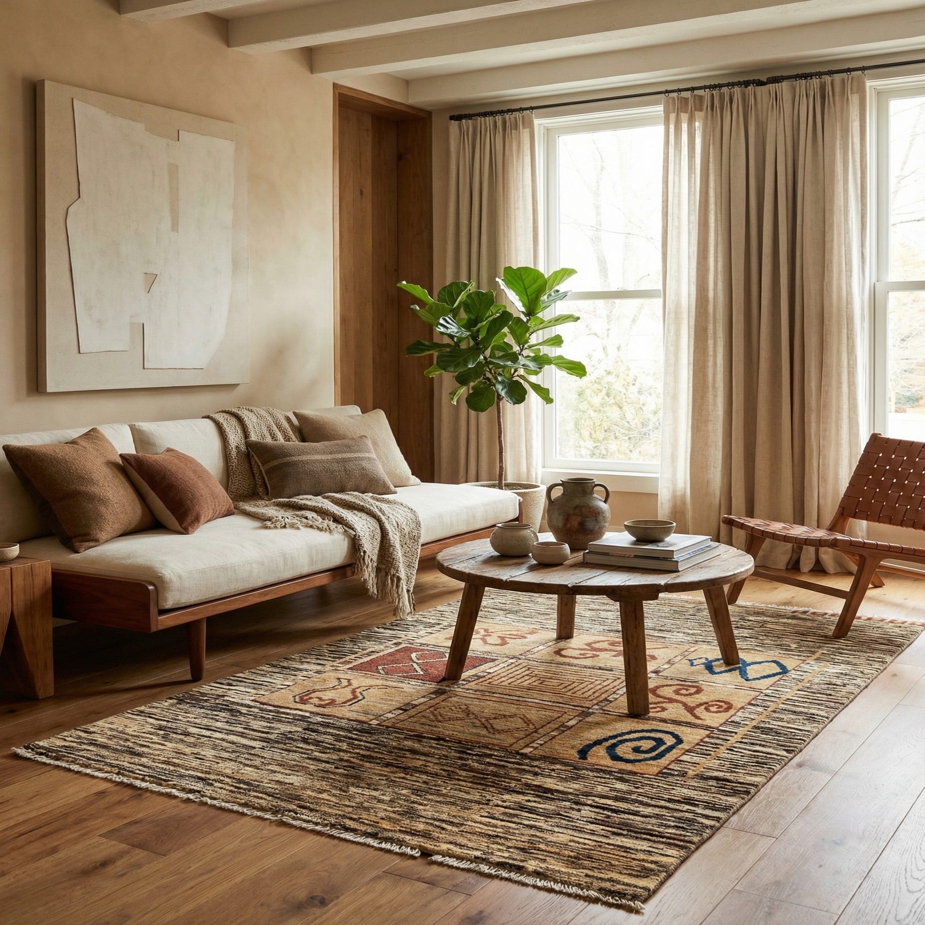 Primary color is Brown. Colors in this rug include: Brown, Beige, Light Brown, Ivory, Navy Blue.