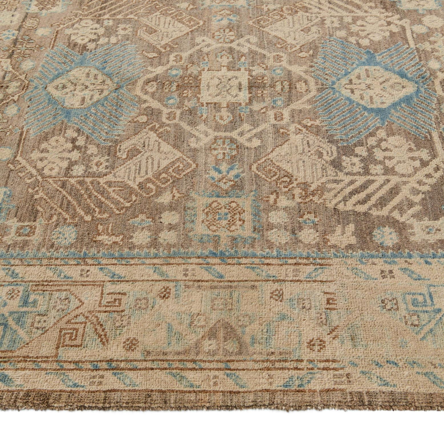 Primary color is Brown. Colors in this rug include: Brown, Beige, Ivory, Blue, Light Blue.