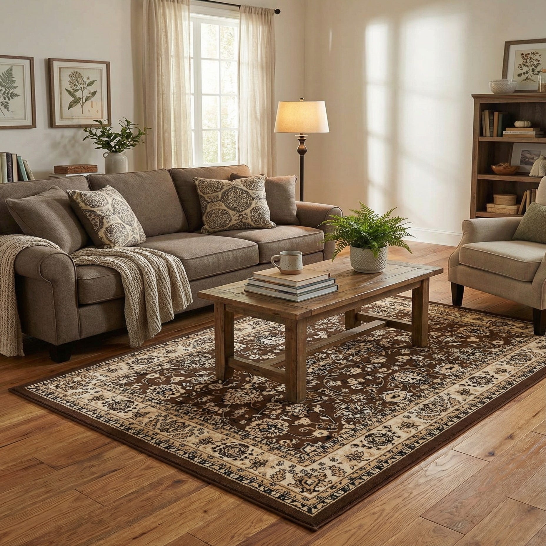 Primary color is Brown. Colors in this rug include: Brown, Black, Cream, Tan.
