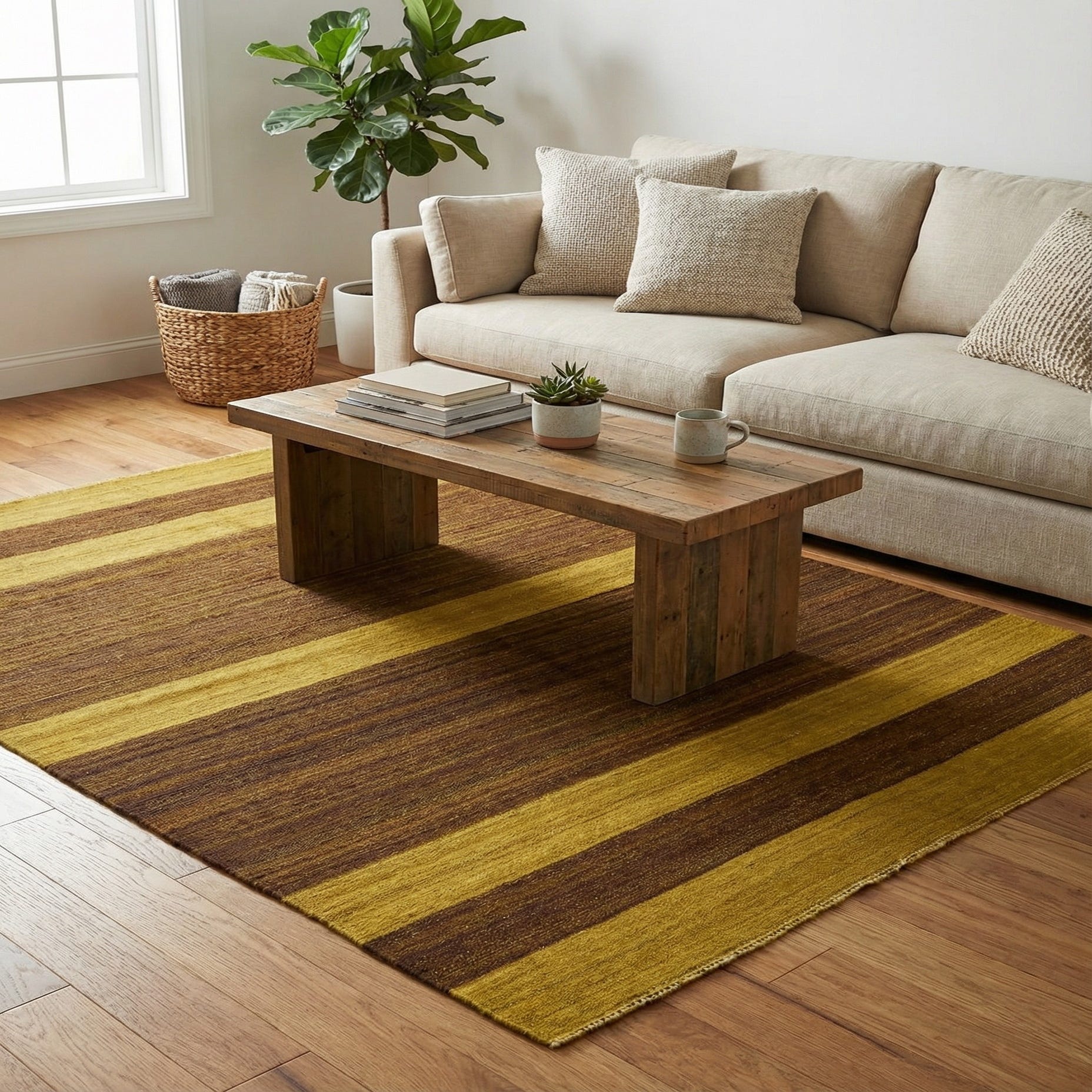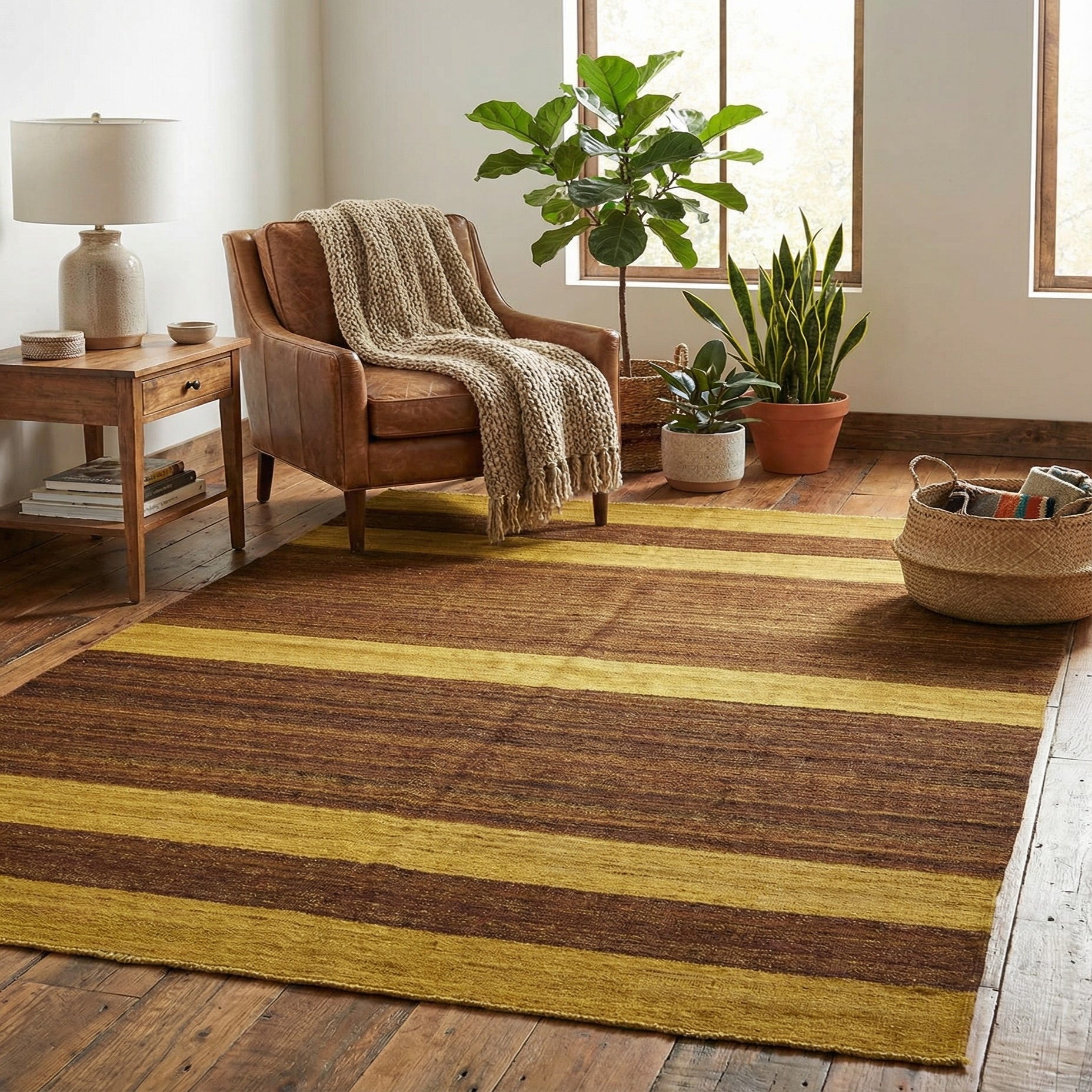 Primary color is Brown. Colors in this rug include: Brown, Tan.