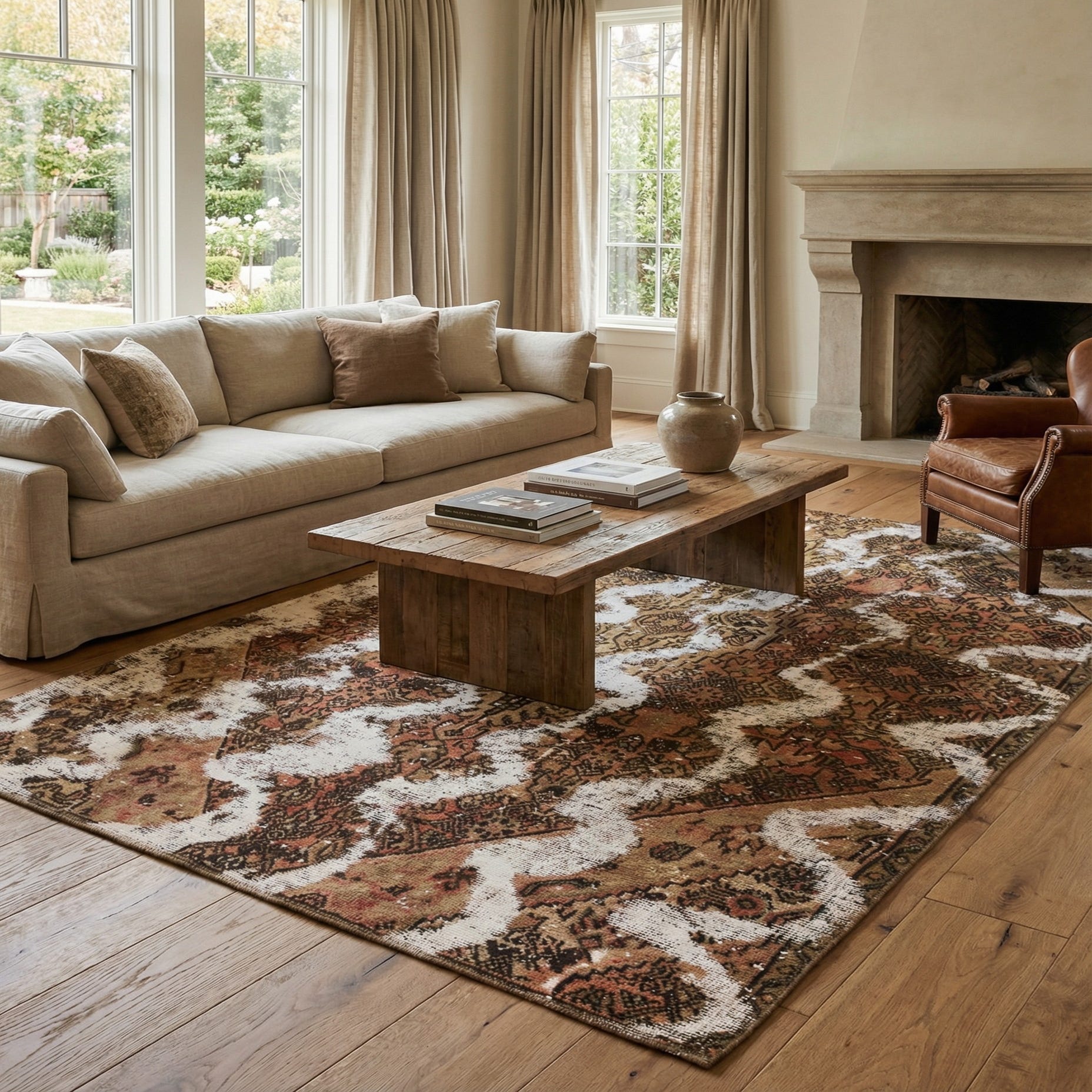 Primary color is Brown. Colors in this rug include: Brown, Black, Ivory, Light Brown, Puce.