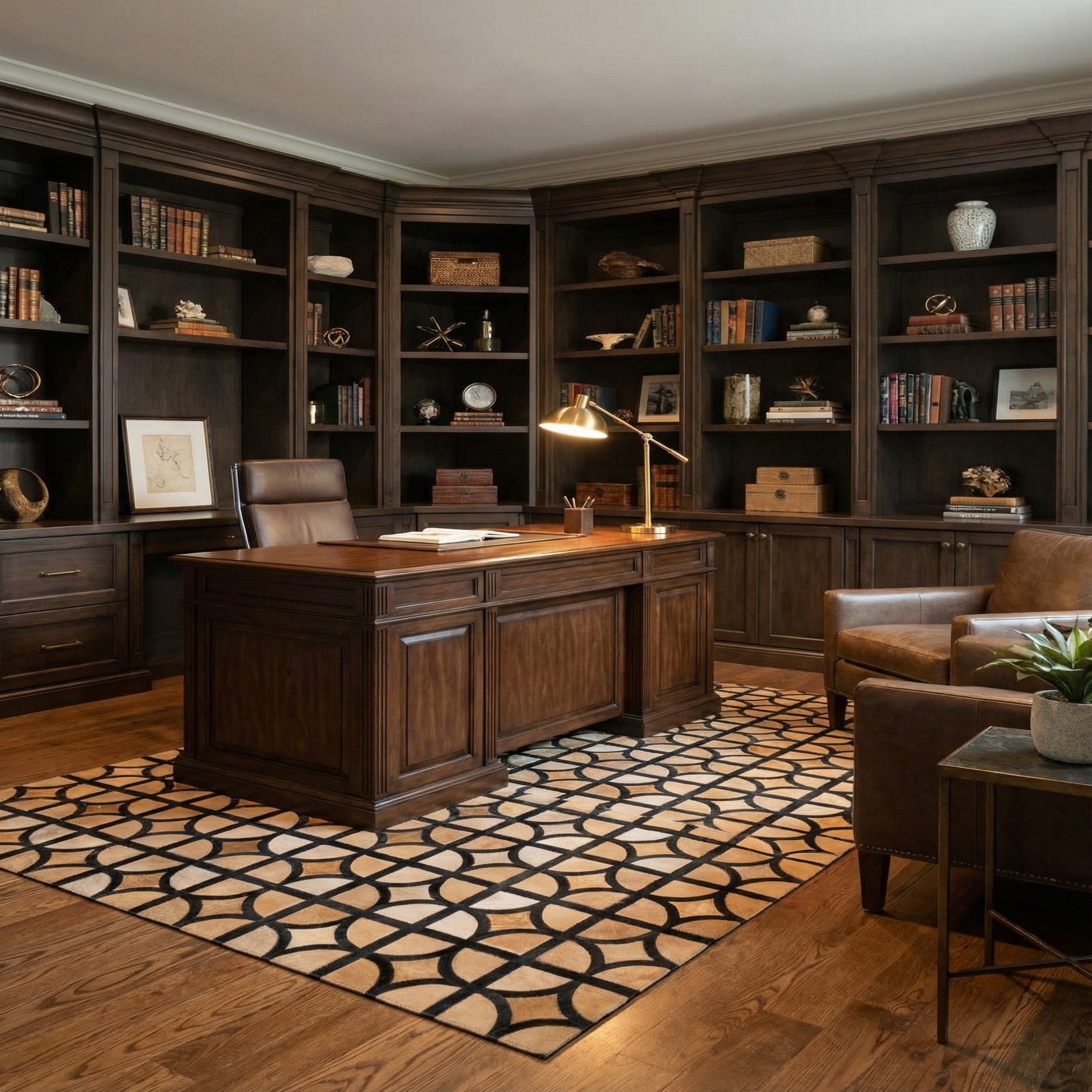 Primary color is Brown. Colors in this rug include: Brown, Black, Ivory, Light Brown.