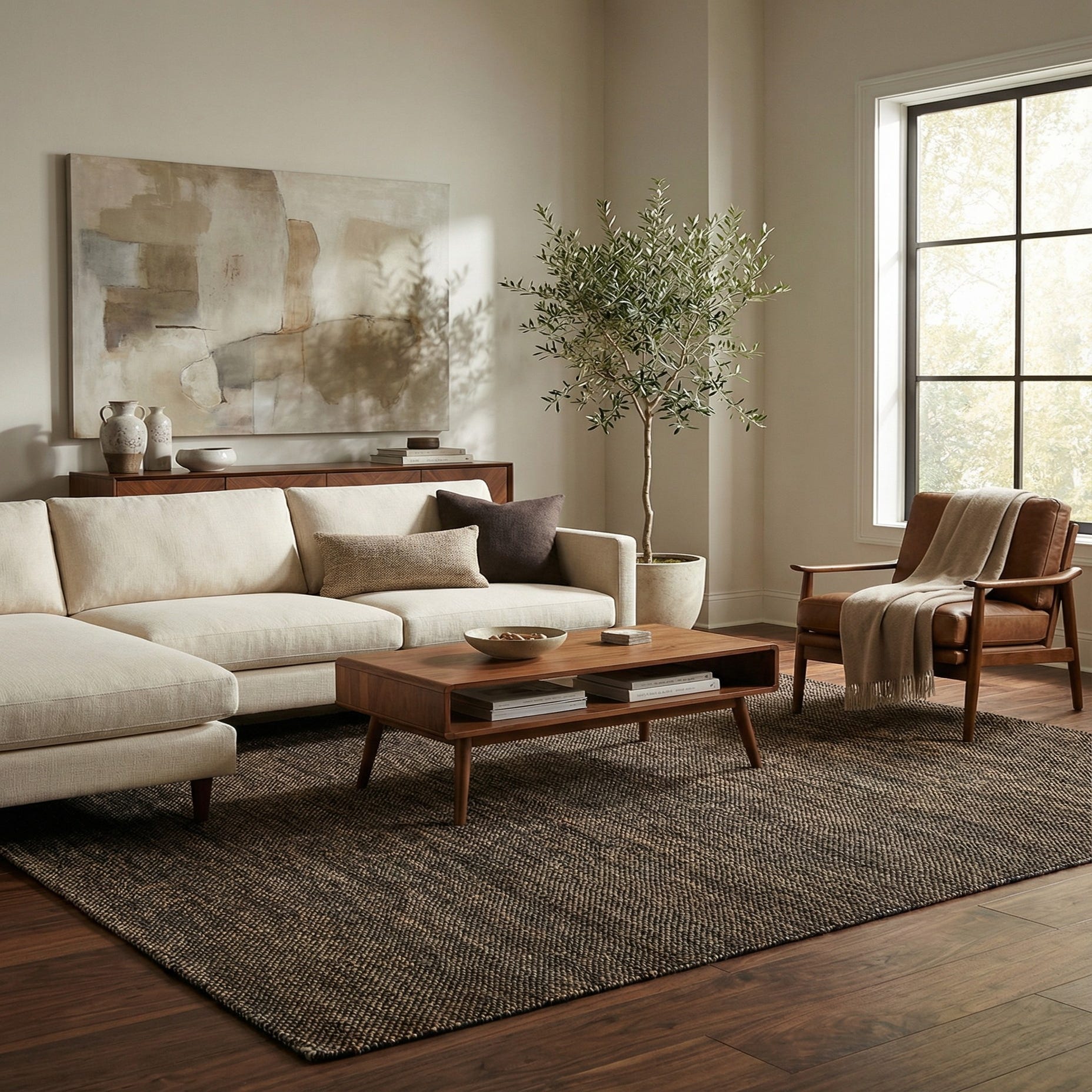 Primary color is Brown. Colors in this rug include: Brown, Brown, Black, Beige.
