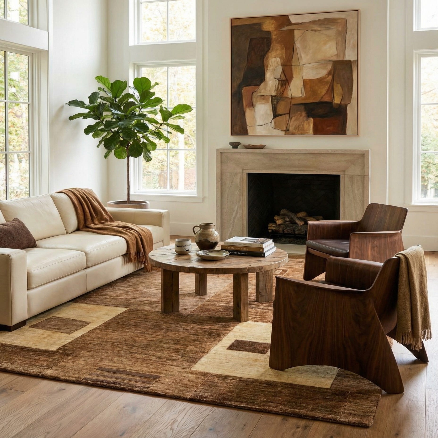 Primary color is Brown. Colors in this rug include: Brown, Brown, Beige.