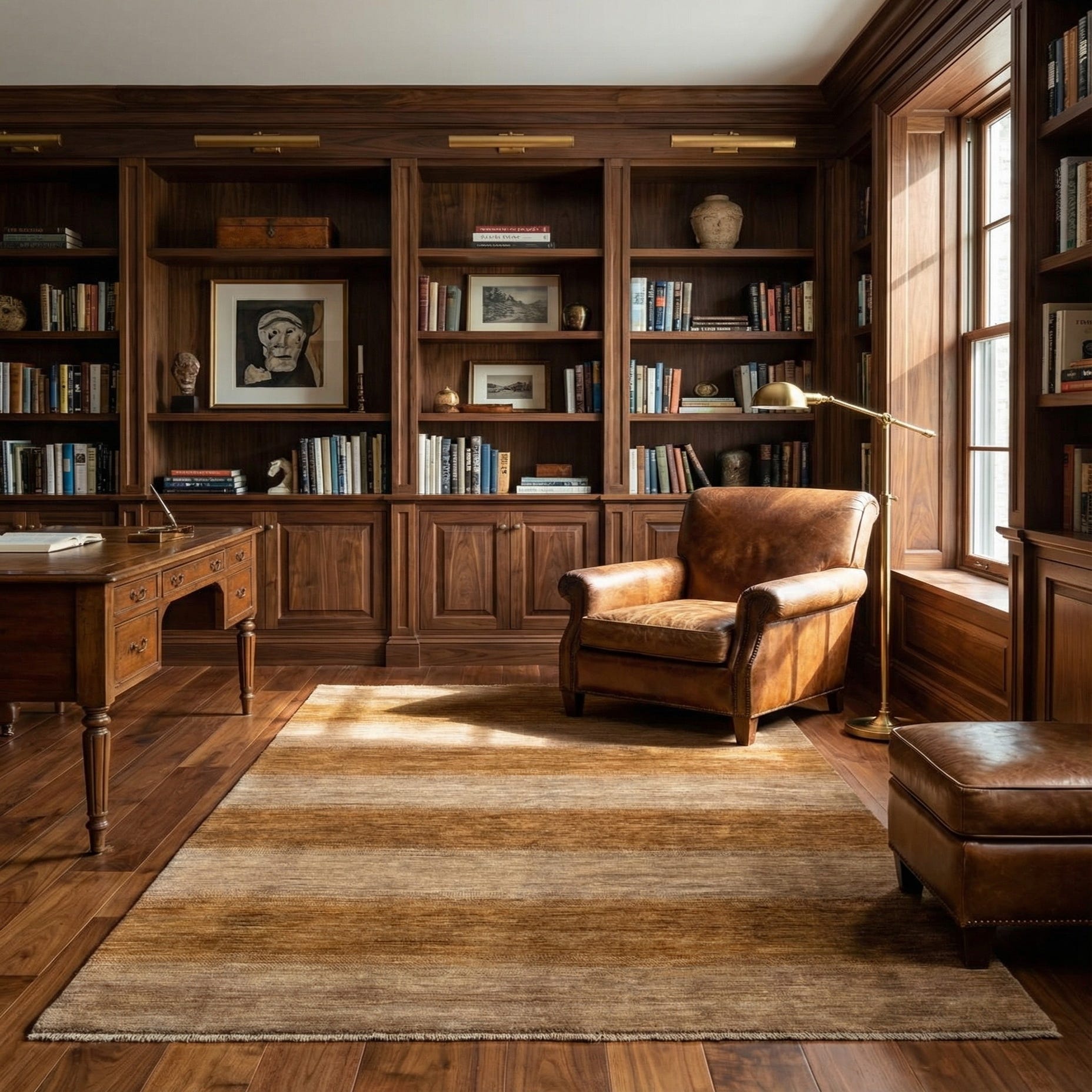 Primary color is Brown. Colors in this rug include: Brown, Brown, Olive Green.