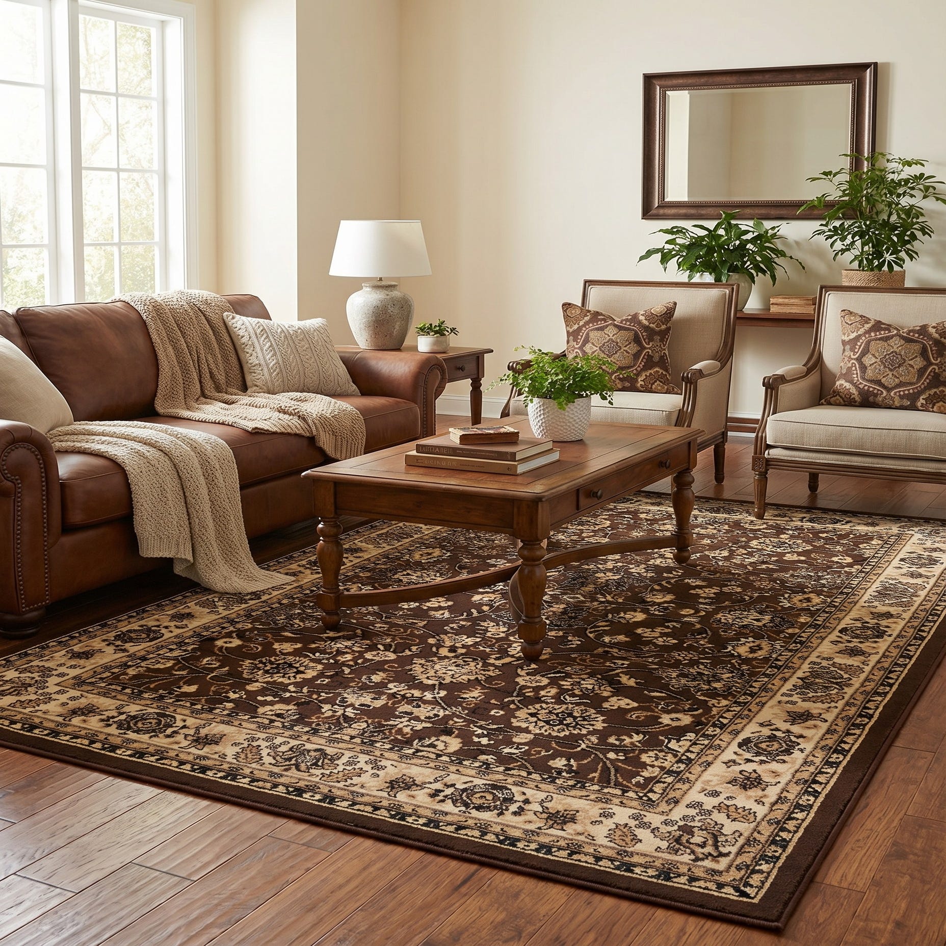 I purchased this rug at the end of November while redecorating my home office. I can’t begin to tell you how much I love this! I bought the burgundy Yasmin 8x8 square rug which is an extremely hard size to find. It fits my room perfectly! The color is a deep rich burgundy with cream beige and brown accents. If you are on the fence about buying this don’t be. It is simply stunning!