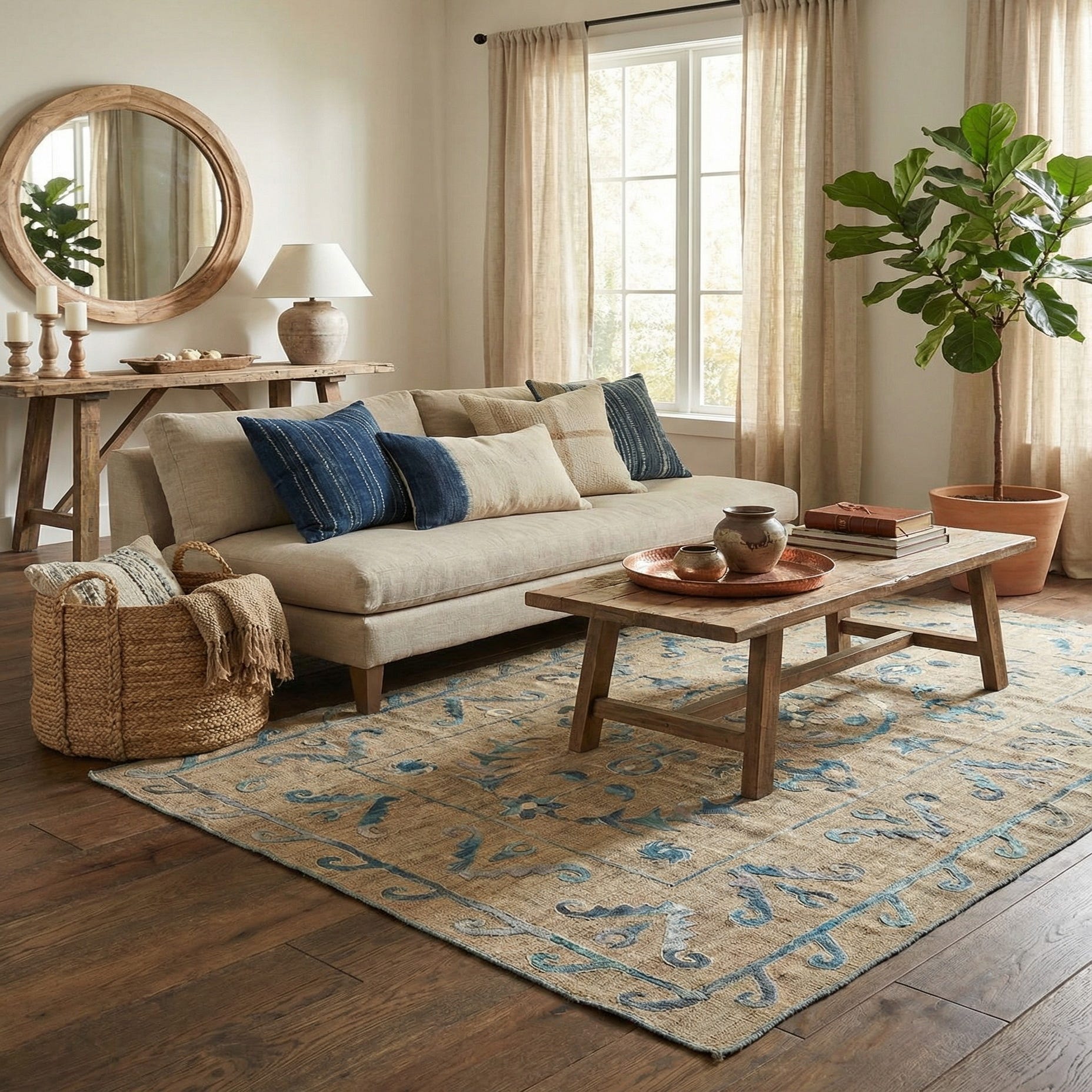 Primary color is Brown. Colors in this rug include: Brown, Beige, Blue, Gray, Ivory, Violet.