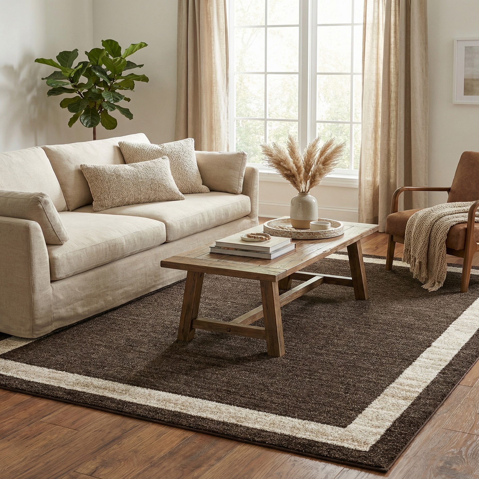 Primary color is Brown. Colors in this rug include: Brown, Ivory.