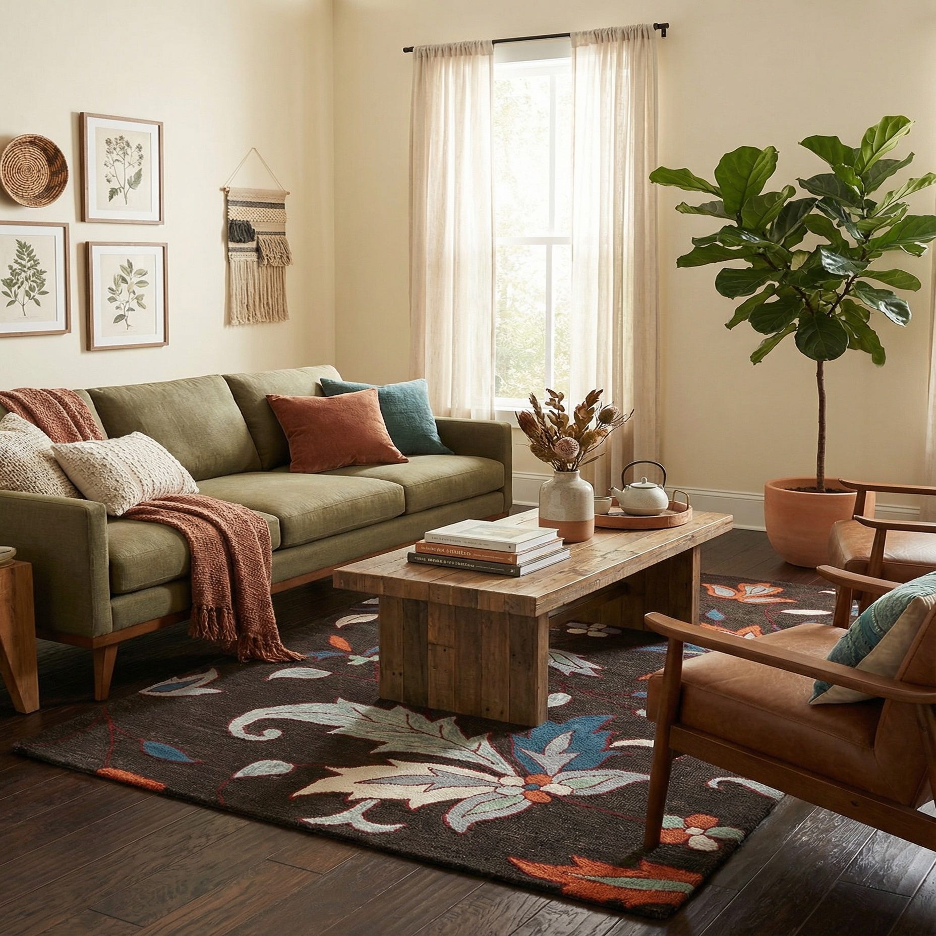 Primary color is Brown. Colors in this rug include: Brown, Gray, Green, Ivory, Red, Orange, Light Blue.